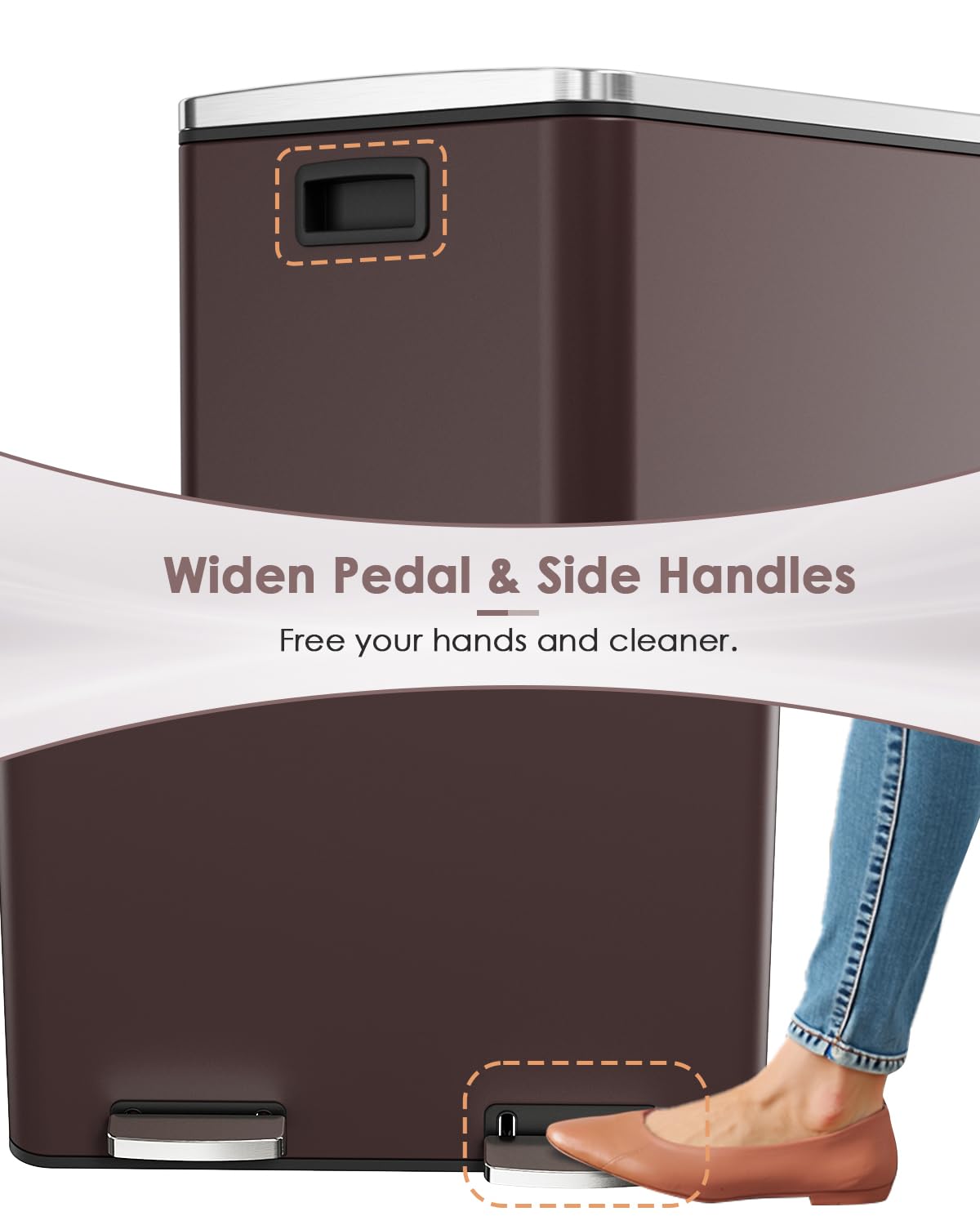 - DUAL TRASH CAN: Trash can has double compartments, which makes it easier for you to separate dry and wet trash. Each compartment has an independent lid to make the trash no smell pollution exists.