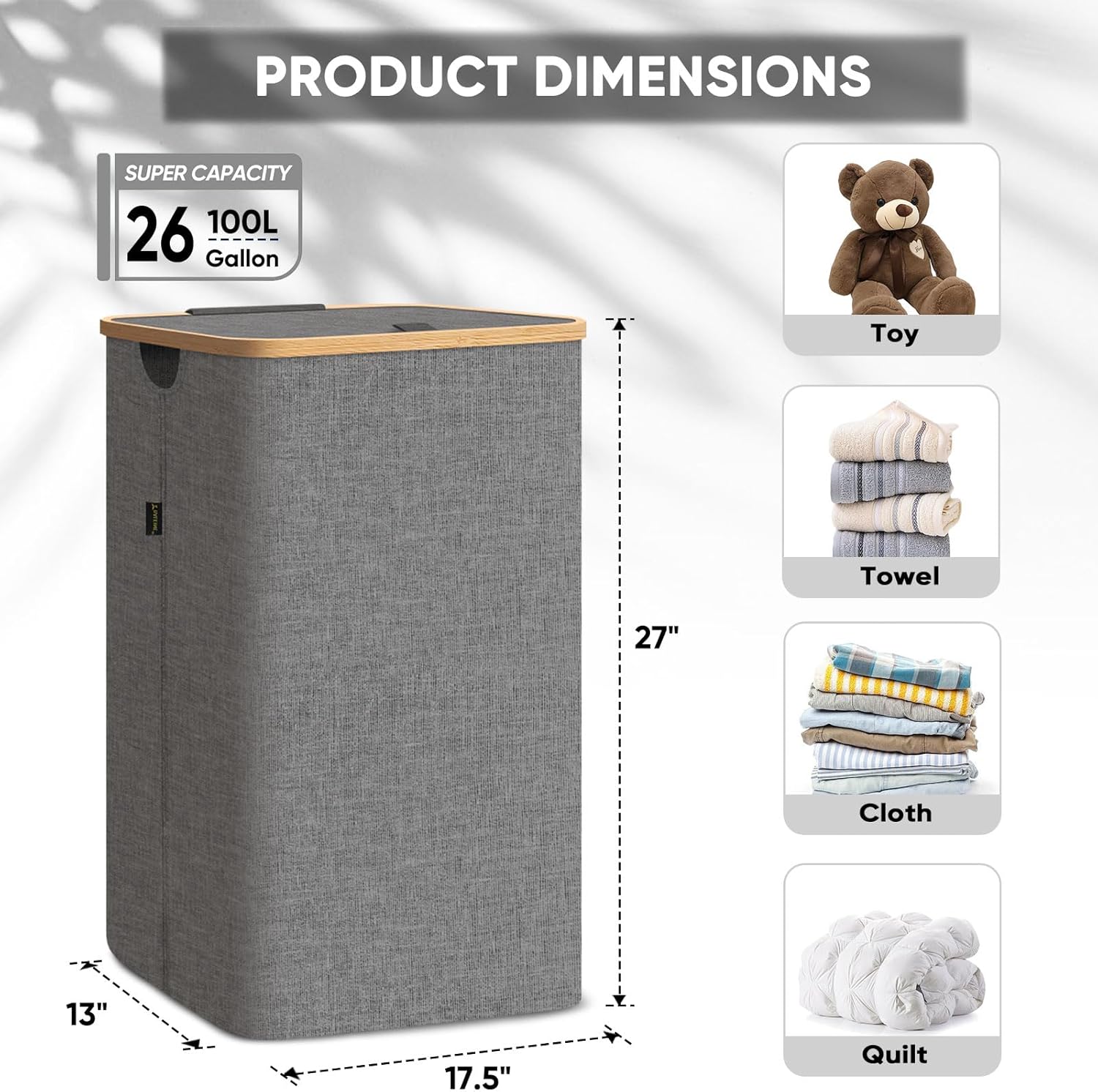 - [AMPLE CAPACITY AND EASY ACCESS] With 26 Gallon/36 Gallon (100 L/140 L) large size option, the hampers for laundry provide ample capacity to hold all your dirty clothes, towels, bedding, and more. The lightweight lid is easy to open and close, providing quick and convenient access to your laundry.