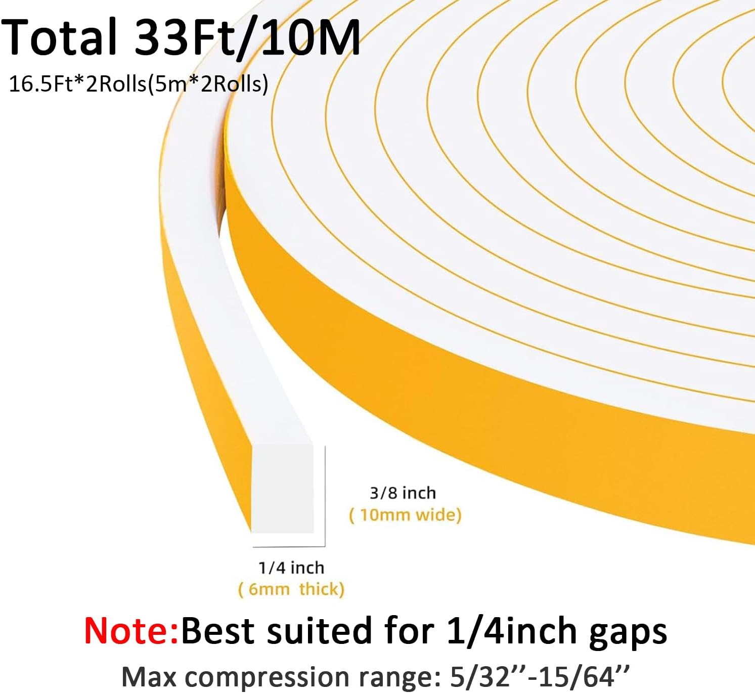 Door Weather Stripping for Doors and Window, Window Insulation Door Seal Tape, Self Adhesive Foam Gasket Tape, Foam Seal Strip Sliding Door Weather Strip, Energy-saving(3/8 in x 1/4 in x 33Ft)