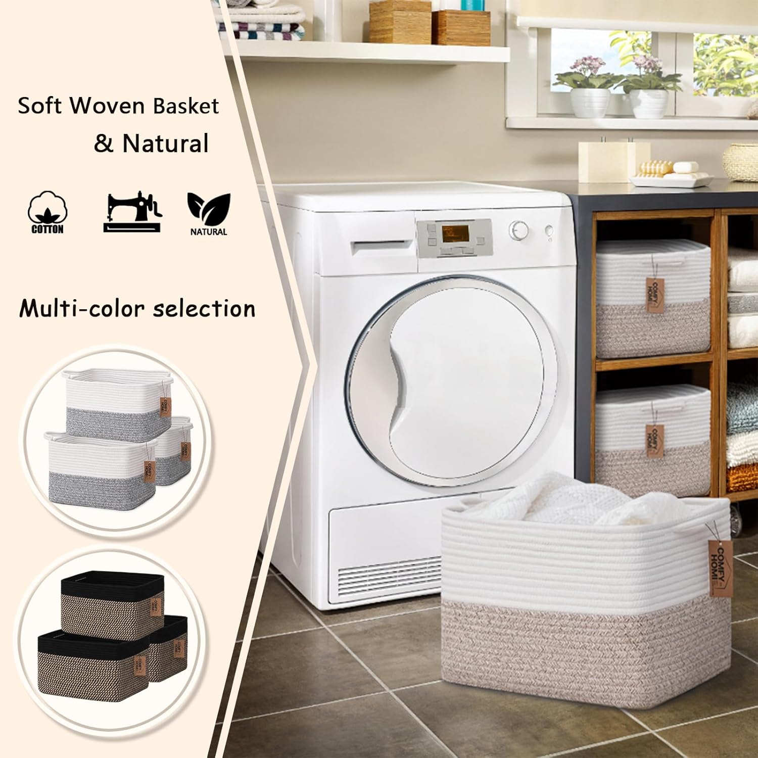COMFY-HOMI 3-Pack Cotton Rope Woven Basket with Handles for Shelves, Books, Toys, Cloth Storage|Towel Storage|Nursery Baby Basket - 13.5" x 11" x 9.5" for Living Room (White/Brown)
