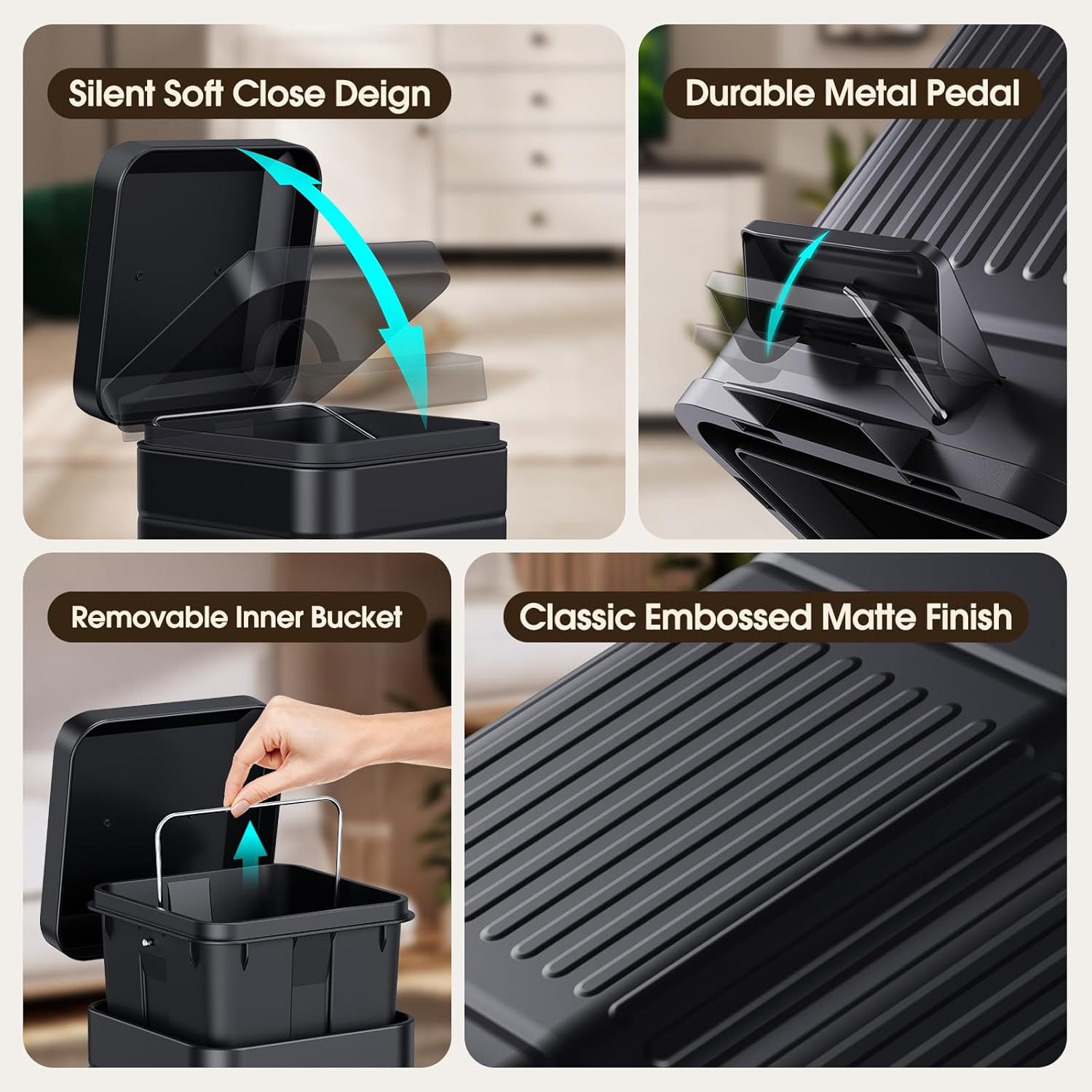 - Silent Soft Close: The step trash can has a damper arrangement that retards the close of allows the lid to close quietly and safely by itself every time, donβt worry about disturbing the rest of your family