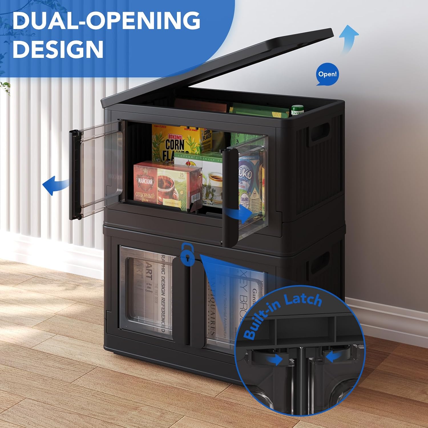 - Dual-Opening Design: You can choose to open the top lid to access items or the front door for easier retrieval. The front door is also transparent, allowing for easy identification of storage contents. Plus, the front door is equipped with a built-in latch that can be locked and unlocked by simply turning the handle.