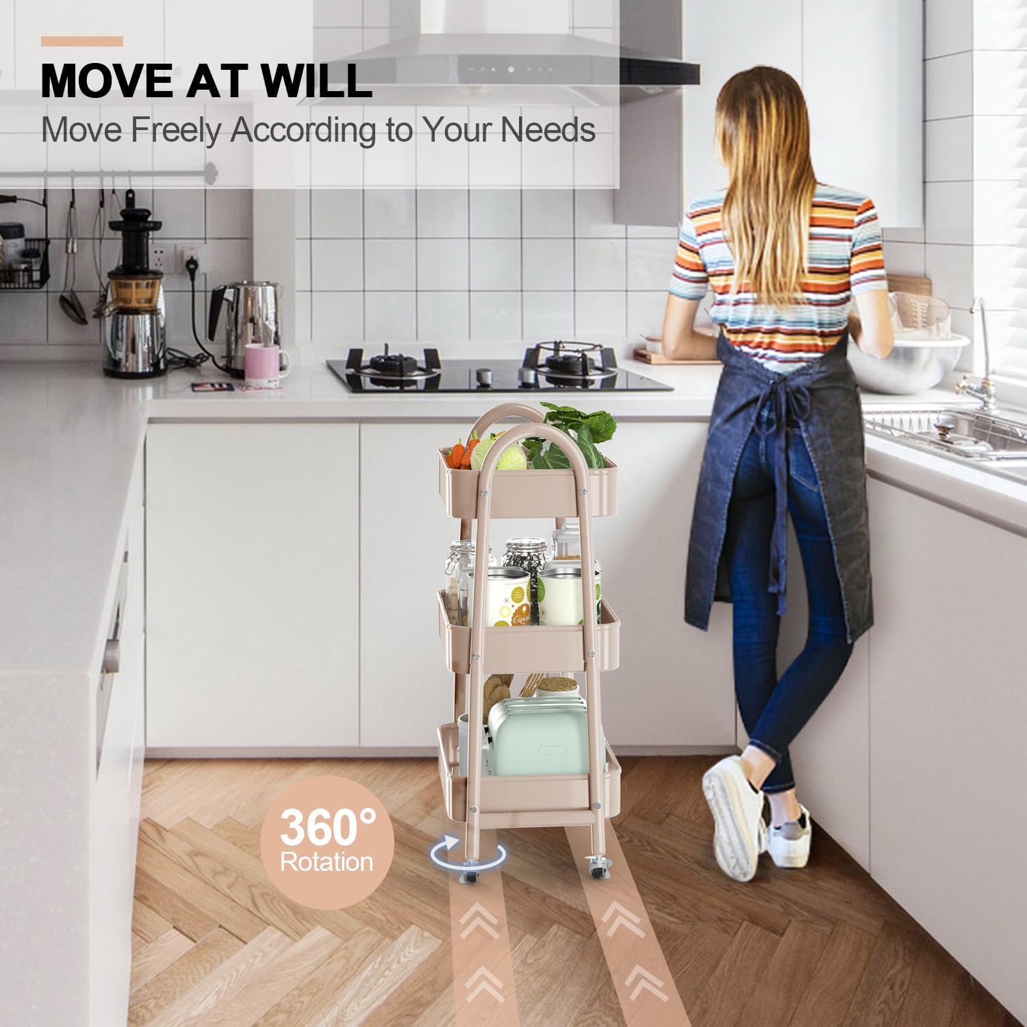 EAGMAK 3 Tier Utility Rolling Cart, Metal Storage Cart with Handle and Lockable Wheels, Multifunctional Storage Organizer Trolley with Mesh Baskets for Kitchen, Living Room, Office, Garage (Beige)