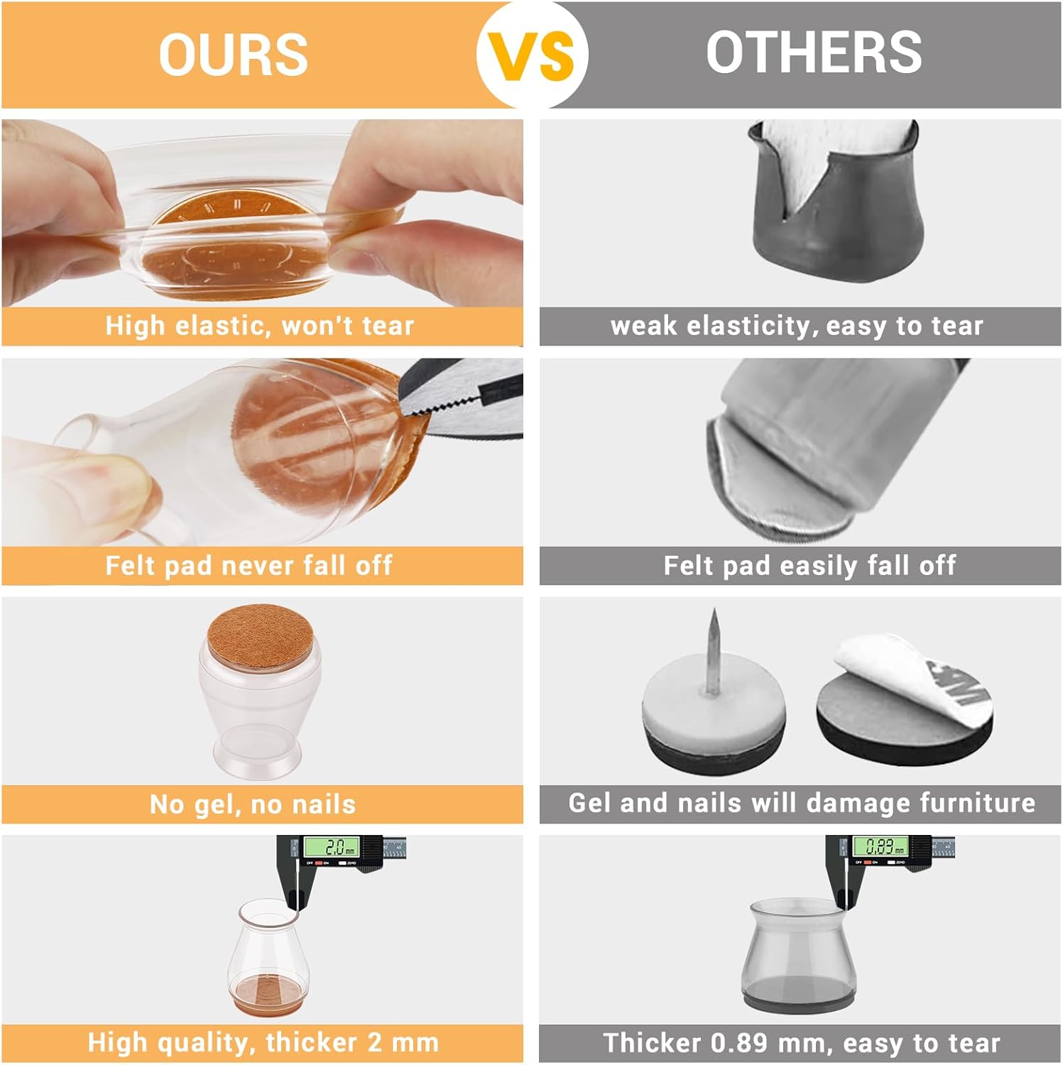 - 【The Felt Pad Never Fall Off】: Latest upgrade! Our chair leg protectors for hardwood floors do not use gel. The bottom felt pad and the silicone chair leg floor protectors are integrated with a high-pressure machine to ensure that they will never fall off. Ordinary felt furniture pads use gel, which is not strong enough, the felt pads are easily sliding off and stain your floor.