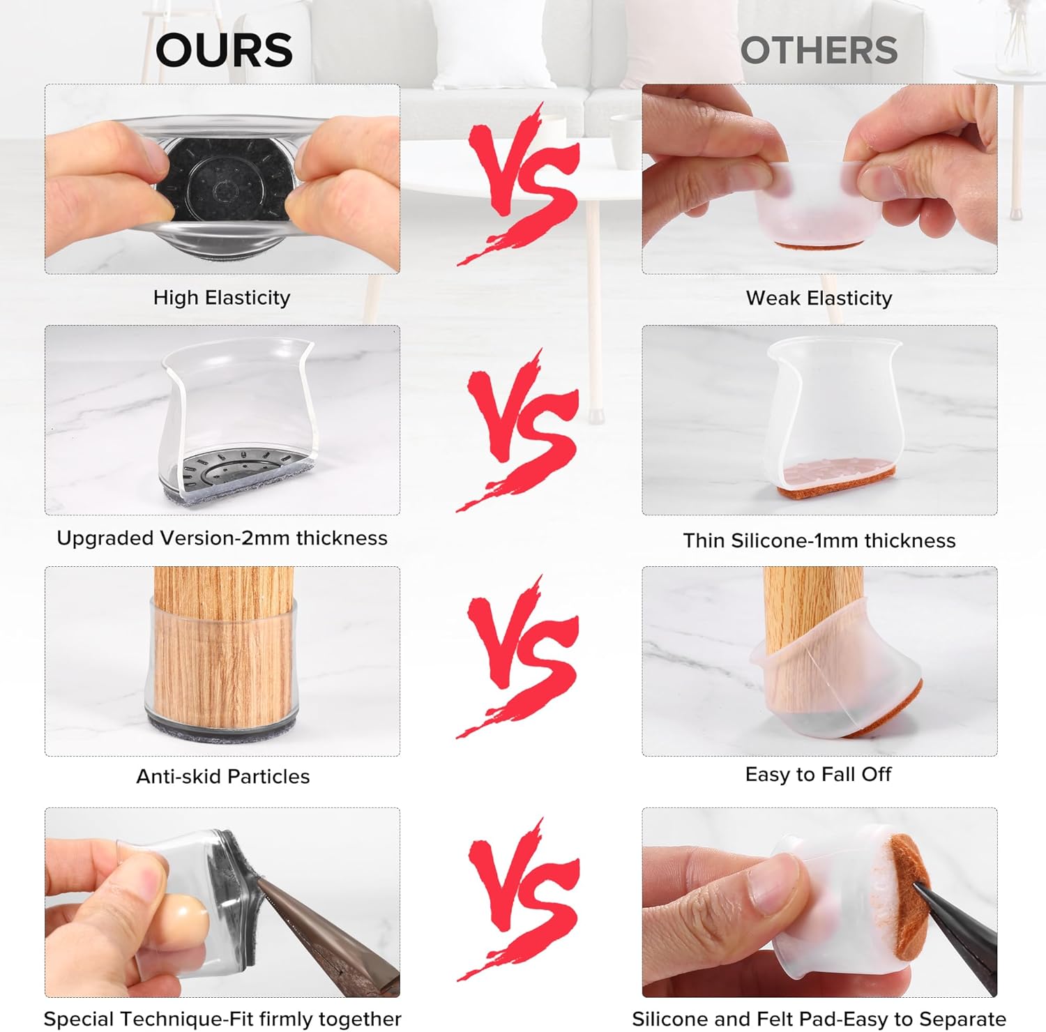 - ✅【Latest Upgrade】Compared with most of the traditional 1mm furniture pads on the market, our silicone chair leg protectors are made of 2mm thick silicone, which will never be damaged, durable. The ruby for chair legs will not change color when stretched. Inside of the inner sleeves are particles with anti-slip, which will firmly fix the chair and never make the covers fall off. Felt pads at the bottom make your furniture move silently and smoothly along floors without leaving marks and noise.