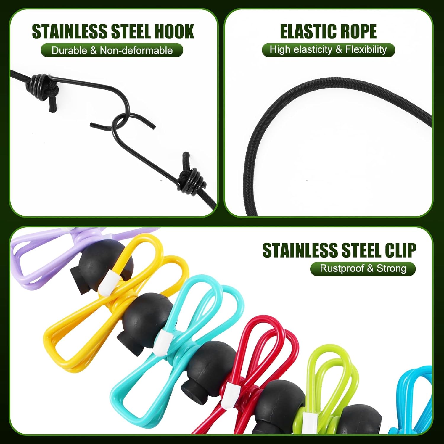 - [Innovative Design] The travel clothesline features 12 colorful clothesline clamps and 13 windproof, non-slip clamps, all designed with a positioning bead. Our sturdy elastic rope supports heavy clothing more effectively than other clotheslines.