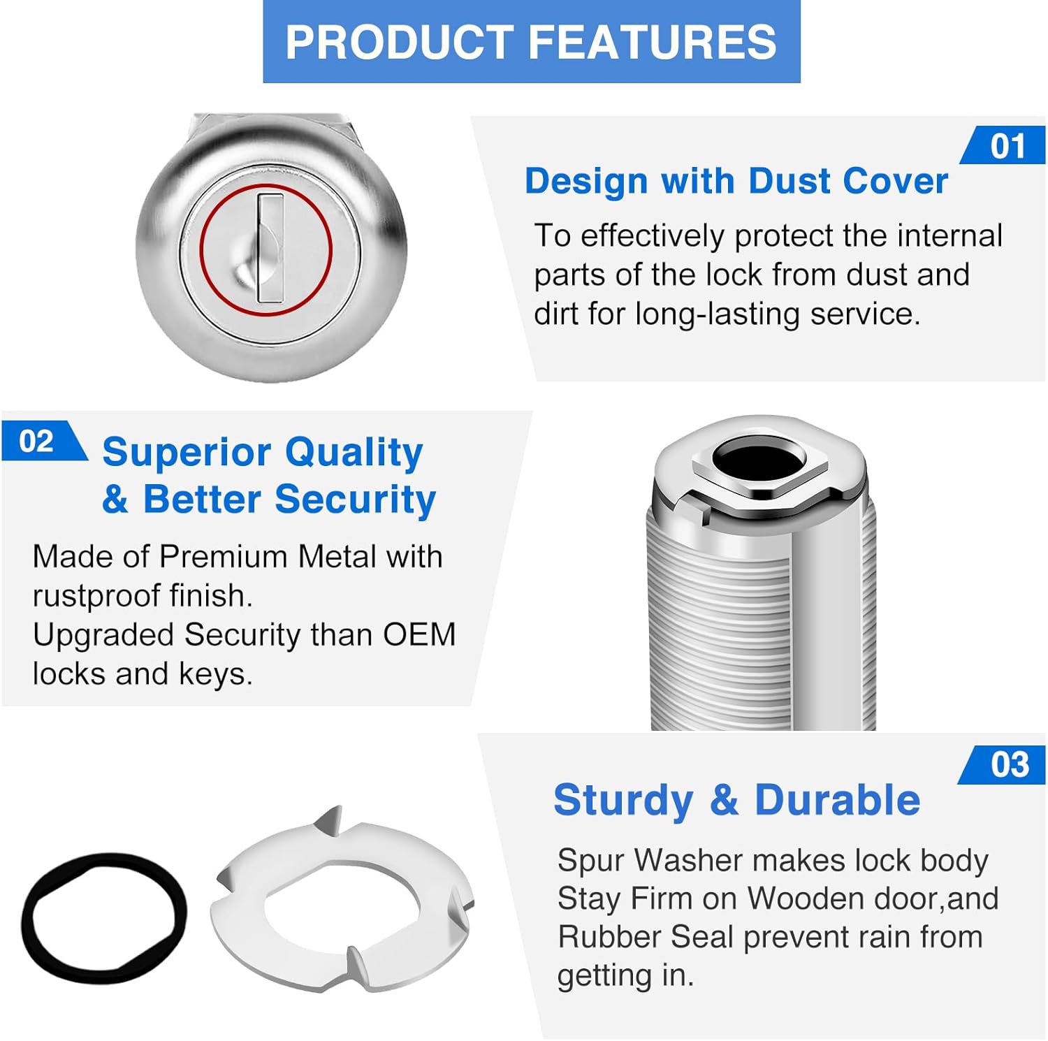 - 【PREMIUM QUALITY MATEL & DUST SHUTTER DESIGN】Cylinnda Cam Lock 2 1/8 Inch is heavy duty lock made of solid stainless steel metal with Chrome Plating to ensure Waterproofing & Rust prevention for long service life. Designed with a Dust Shutter to protect the keyhole from dust, debris& rainwater.