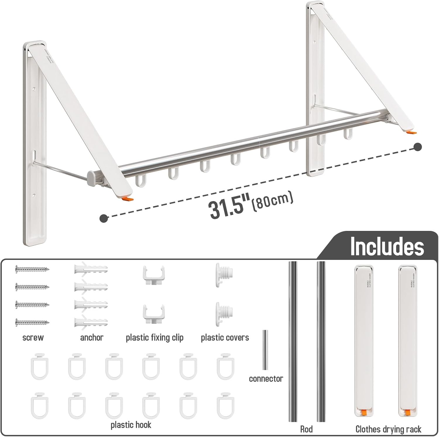 - Rich accessories: With just one order, you can purchase a complete set of drying tools. Our package includes 2 foldable clothes hangers, two 40cm long clothes poles, a clothes pole connector, 12 hooks, and necessary fixing screws