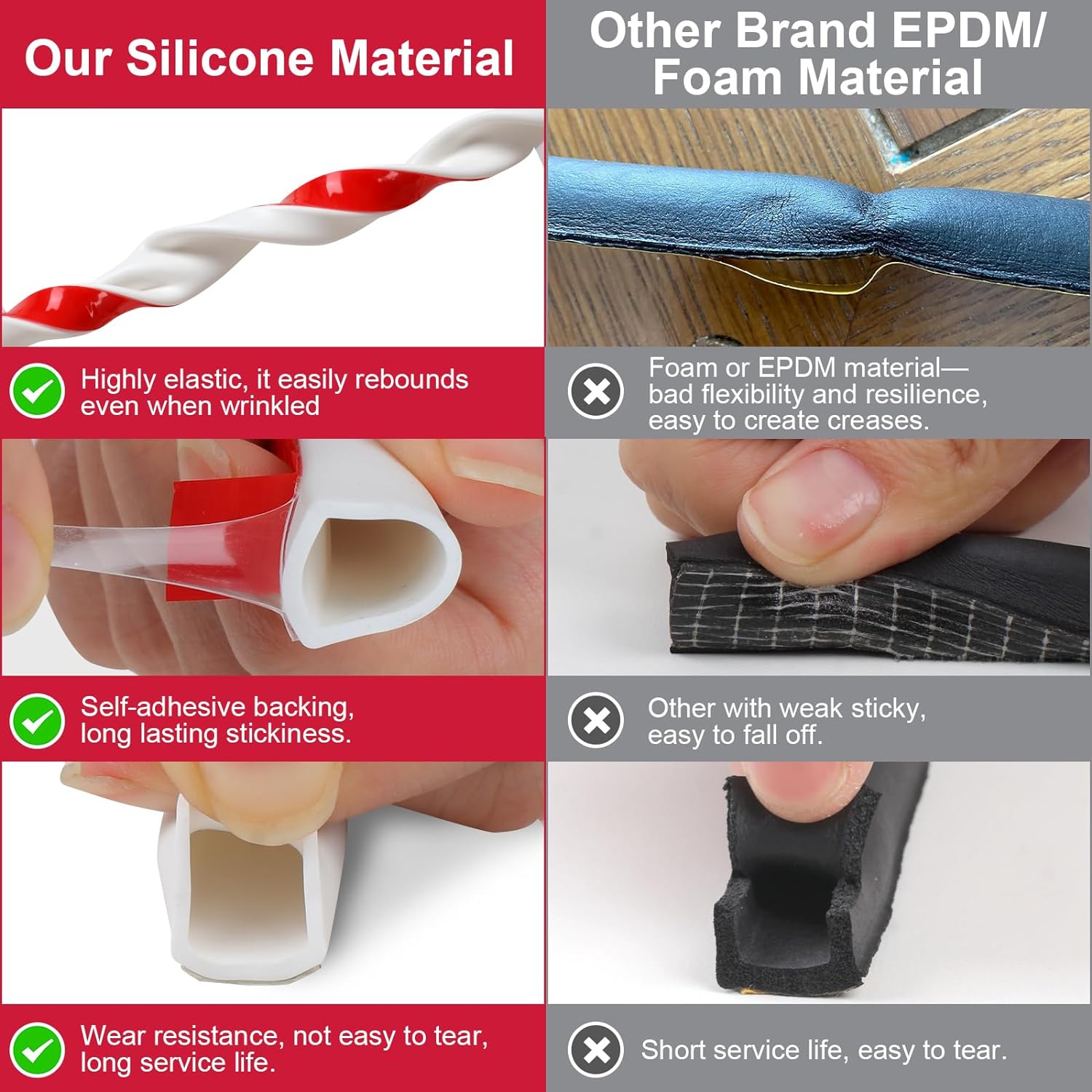 - High-Quality Silicone Material: Our door seal strip is made from premium silicone, offering greater durability and flexibility compared to foam or EPDM rubber strips. Silicone withstands temperatures up to 200°C, remains flexible in cold conditions, and resists cracking, making it ideal for long-lasting use