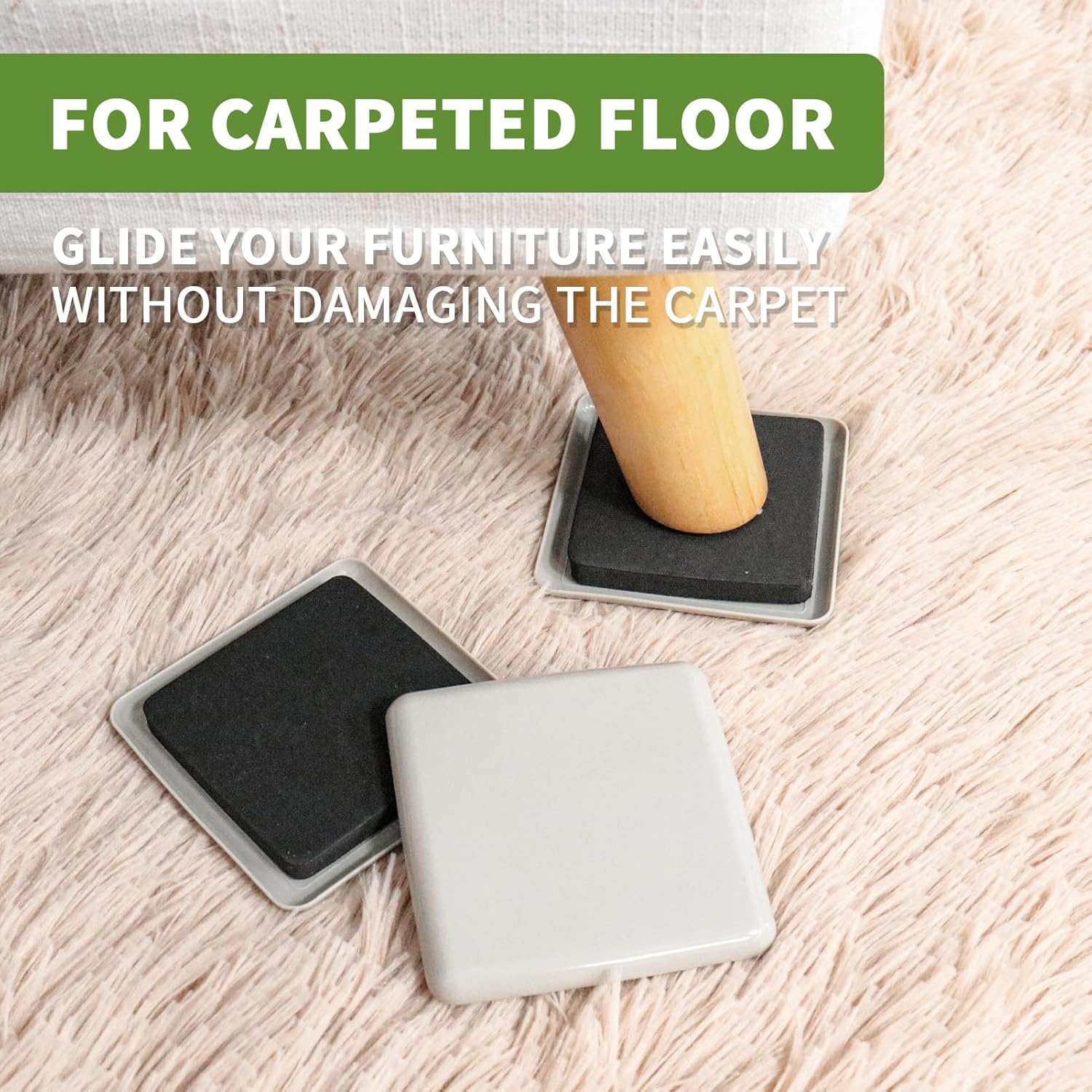 - Move Furniture Effortlessly - Our square heavy furniture sliders for carpet surfaces move easily across the surfaces of carpets and rugs. These couch sliders for moving furniture make cleaning or rearranging your furniture a one-person job. Move bulky and heavy objects with convenience. Furniture carpet sliders perfects for both round and square furniture legs and provide lasting protection with bottom furniture movers sliders.