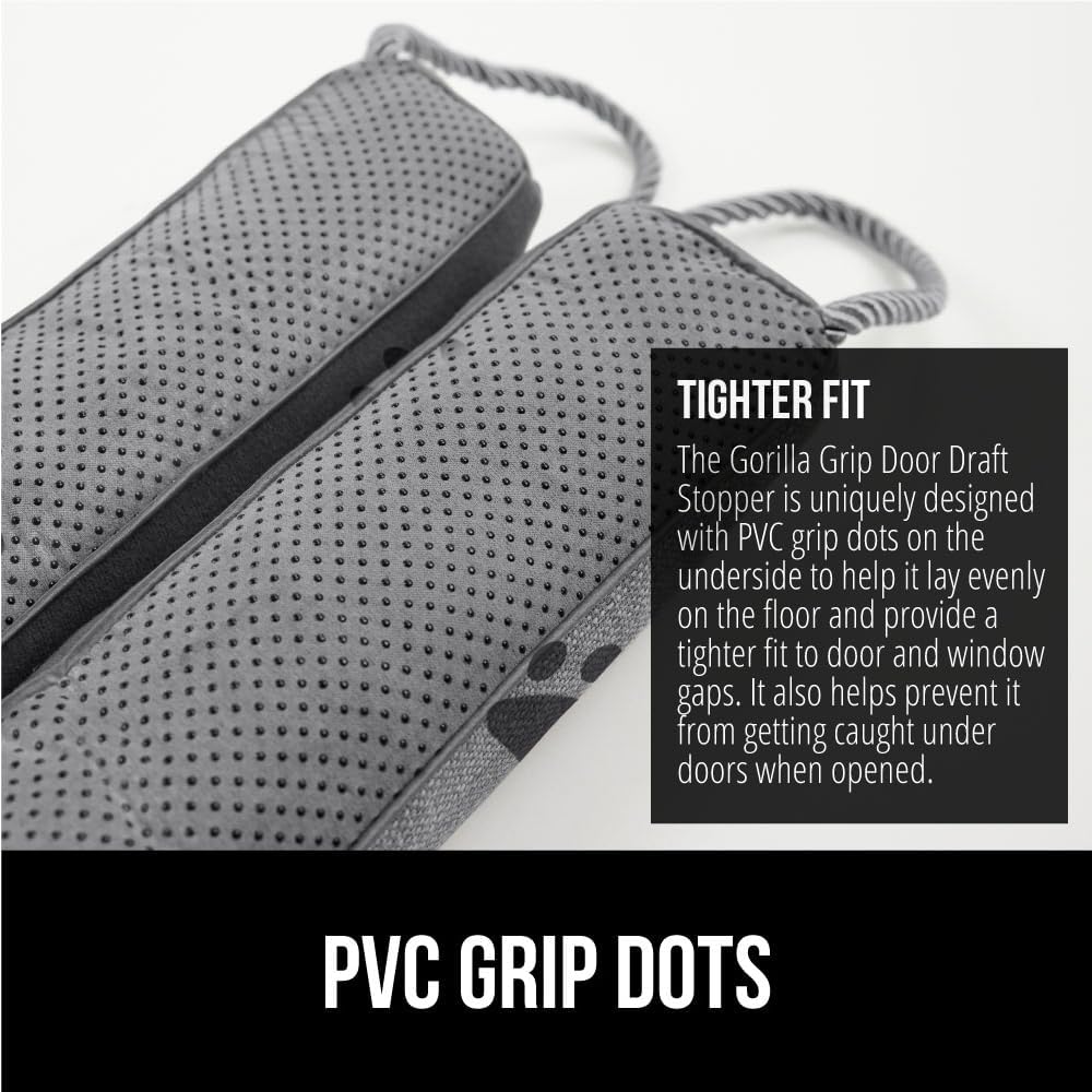 - STAY IN PLACE GRIP DOTS: uniquely designed with PVC grip dots on the underside to help stopper lay evenly on the floor and provide a tighter fit to door or window gaps; grip dots help prevent curling and keep stopper from getting caught under doors when opened; please install with grip dots on the floor