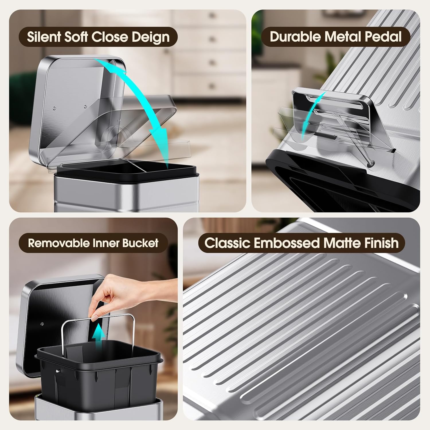 - High-Quality Material: this trash can is made from stainless steel can, thick and durable, and anti-fingerprint; The inner barrel is made of pp material