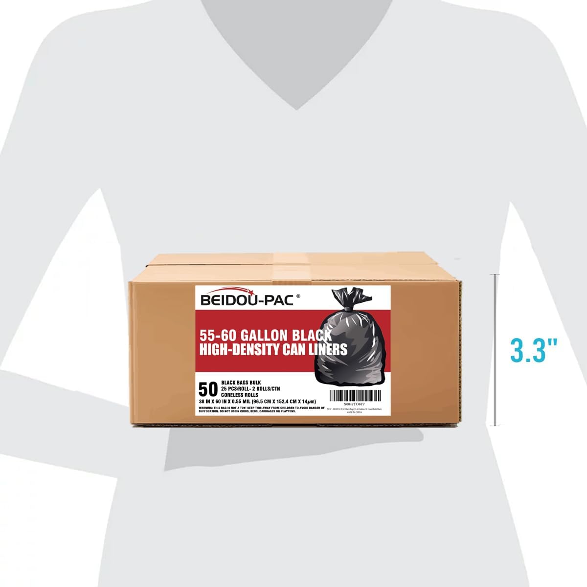 - 1, Product information: BEIDOU-PAC 55-60 gallon large black plastic recycling trash bags, Size: 38"* 60"x 14 mic, Total 50 bags bulk (25 PCS/ROLL, 2 CORELESS ROLLS/CTN), Perfect for 40-45 Gal Capacity Office, commercial, industrial, or residential waste.