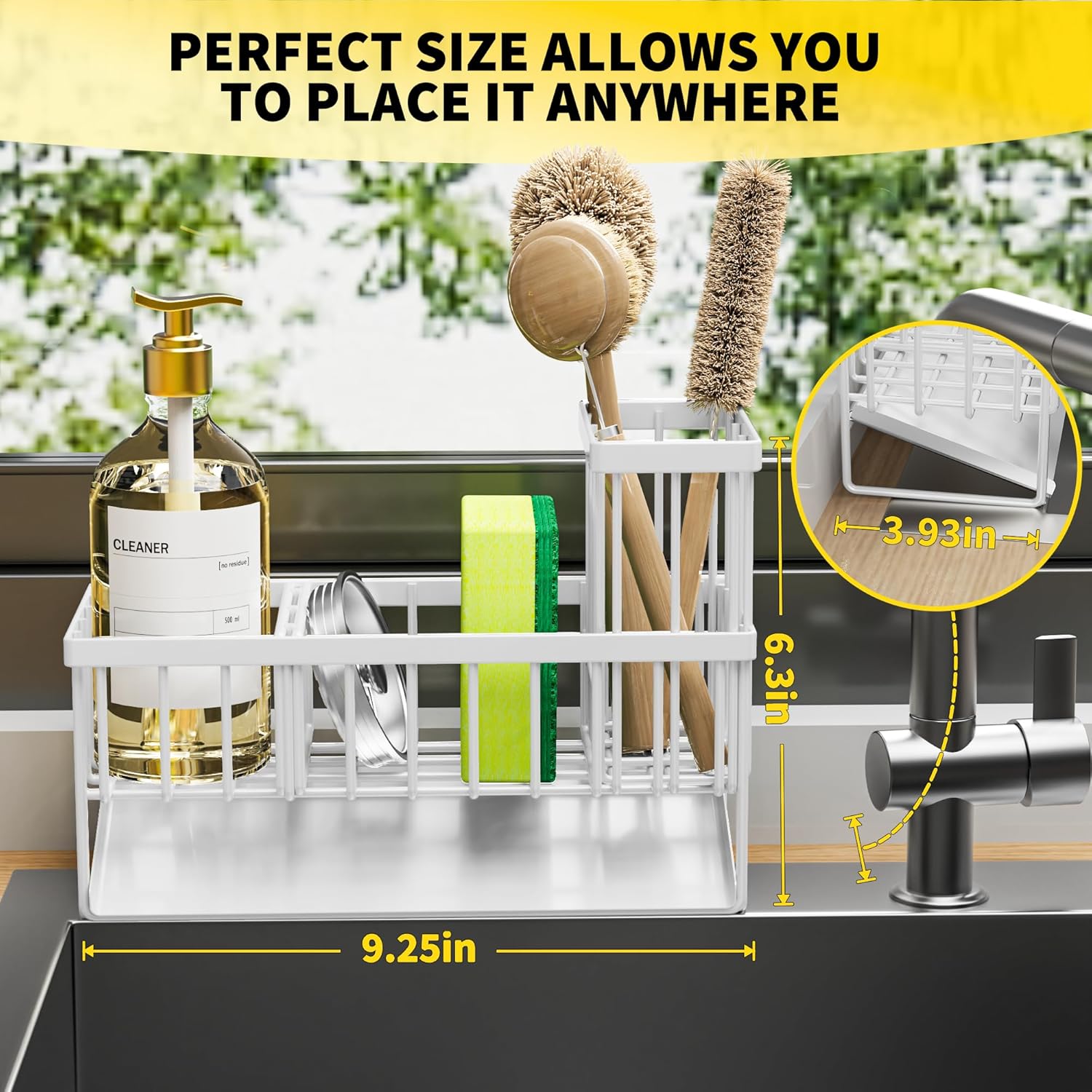- 【SMALL VOLUME】 Cisily sponge holder is suitable for kitchens with limited space. It measures only 9.25"*3.97"*6.37", Holds a detergent bottle, a sponge ball and sink stopper. With an extra upgraded brush holder that can hold up to 4 small and large sized brushes, with the Cisily Sink caddy you can save countertop space perfectly.