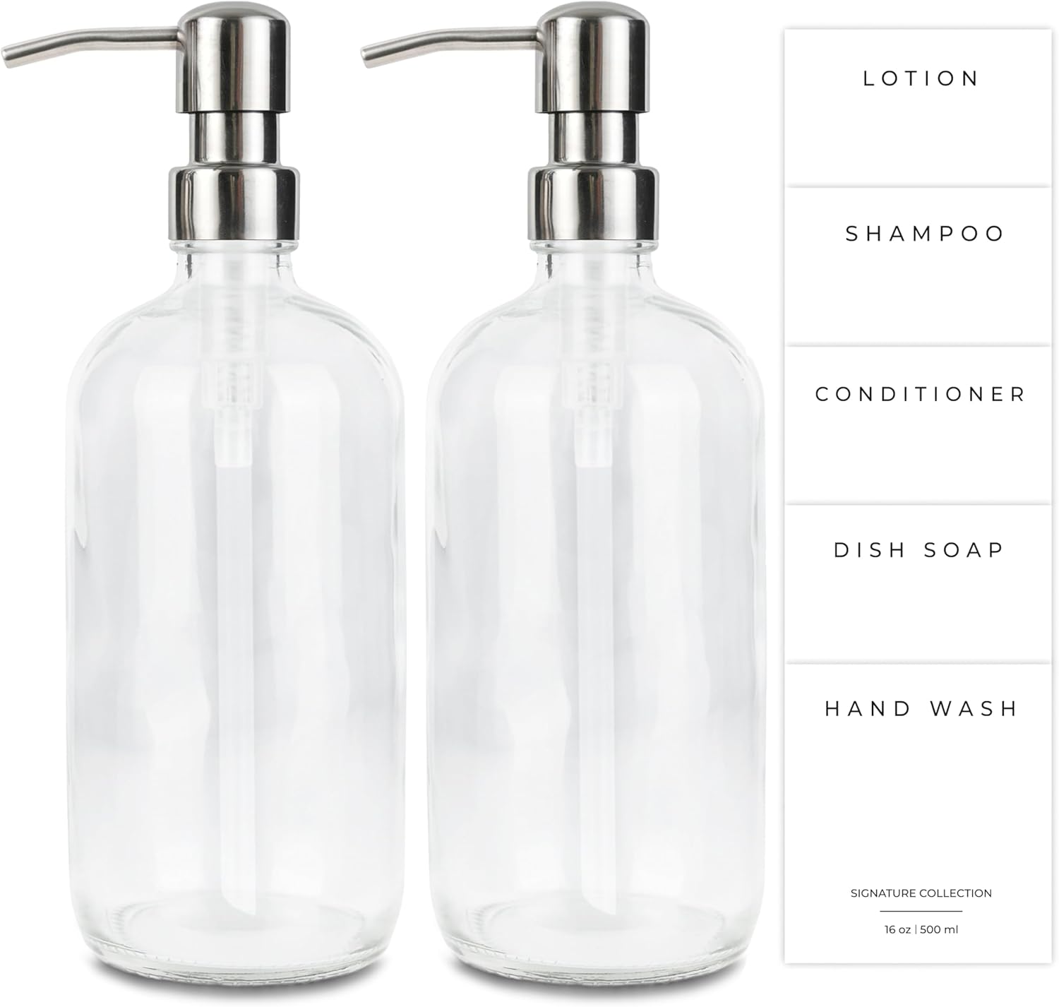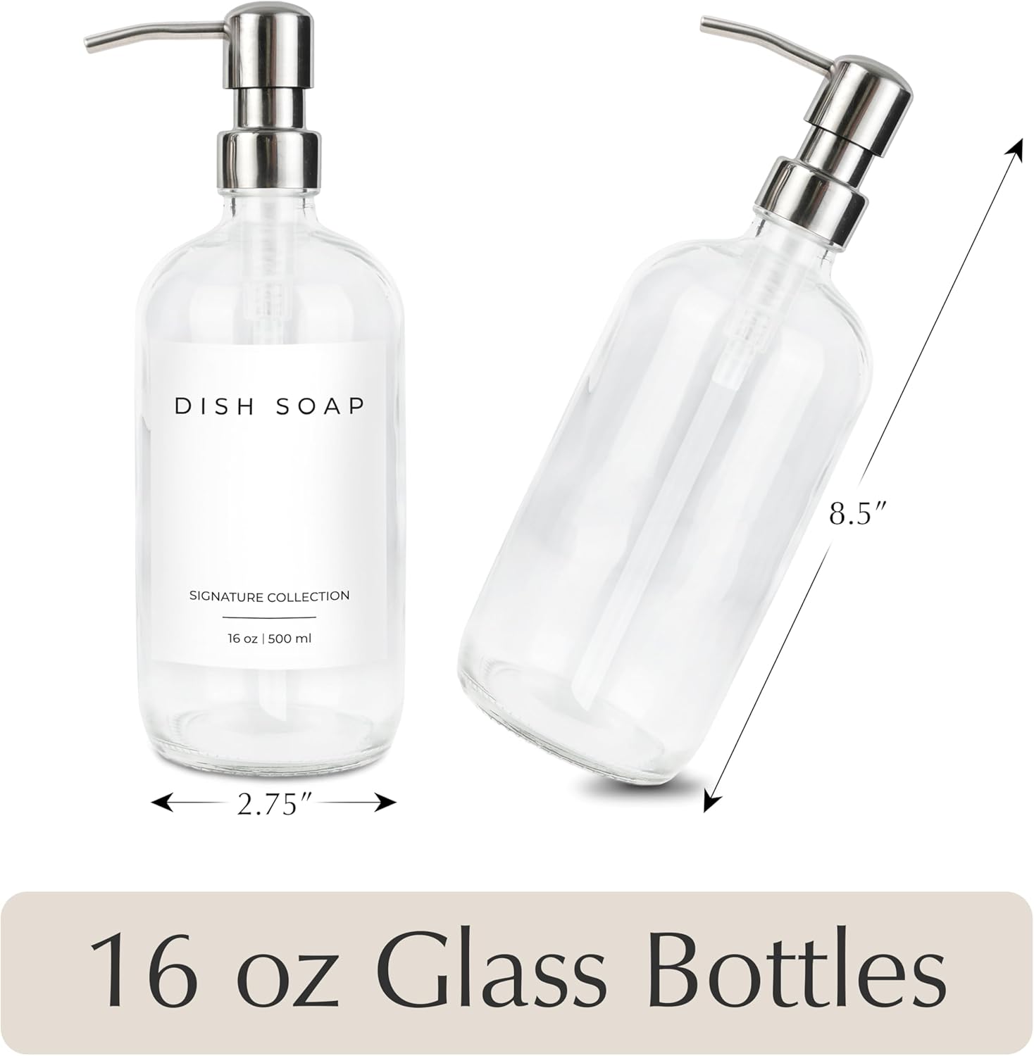 Emerson Essentials Glass Soap Bottle Dispensers, 2 Pack, Stainless-Steel Pumps Rust-Free, Hand Set for Bathroom Kitchen Sink, Liquid Lotion Shampoo Jars with 4 Waterproof Labels, 16 Oz Chrome