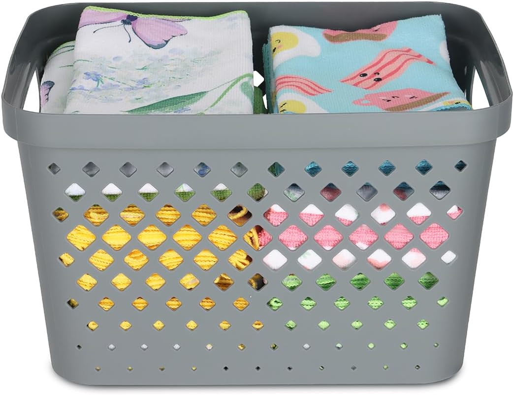 - PANTRY ORGANIZATION AND STORAGE BASKETS – These grey pantry baskets for kitchen are perfect for storing and organizing snacks, spices, oils, kitchen gadgets, utensils, and more. Our plastic cupboard baskets are great for cabinets, shelves, and drawers.