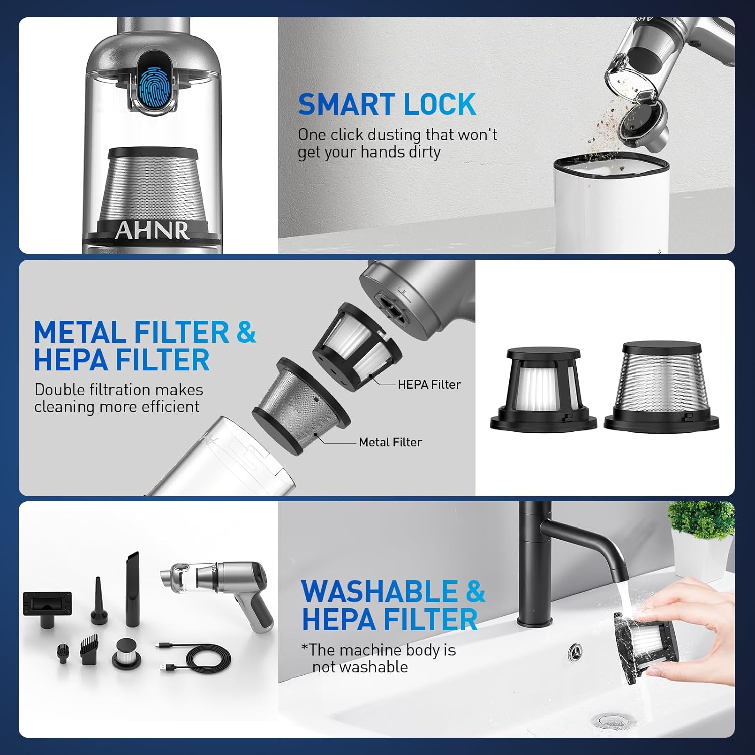 - ☑️【DUAL FILTRATION SYSTEM】Car vacuum portable cordless cleaner has a dual filtration system. The first steel mesh filter is capable of filtering large particles of debris. The second is a washable and reusable HEPA filter, which can effectively filter fine particles and prevent damage to the motor. One-touch dust removal design, just one click, the garbage can be emptied smoothly without dirty hands. Note: The machine body is not washable