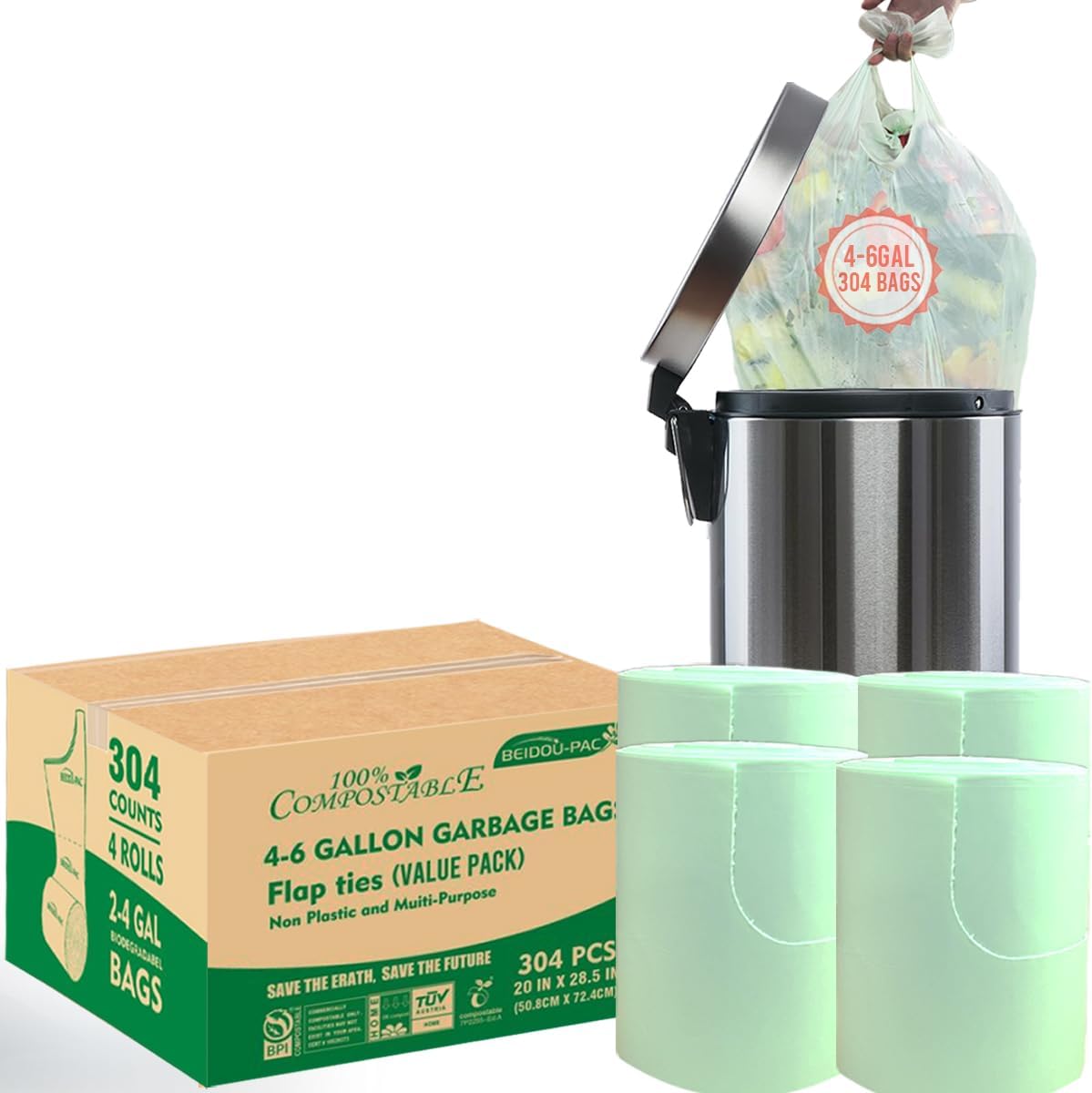 4-6 Gallon Flap Tie Compostable Trash Bags, 304 Count, Compost Bags Kitchen Trash Bags, Sturdy Biodegradable Garbage Bags Food Scrap Waste Bags, ASTM D6400, US BPI Certified