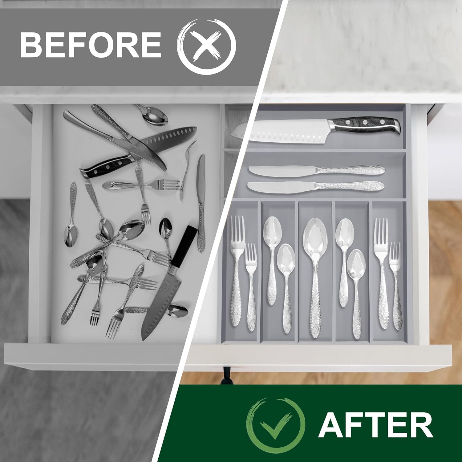 - 【Made of natural bamboo】Our flatware organizer is made of natural bamboo. The material is taken from bamboo that have grown for more than 4 years which make our silverware holder for drawer use a durable kitchen piece that ll last you for years. The Environmentally material keep our flatware & utensil water and odor resistant. Even the knife won't leave scratch on it.