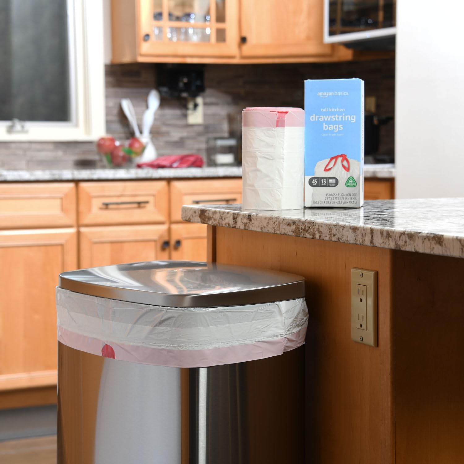 Amazon Basics 13 Gallon Tall Kitchen Drawstring Trash Bags, Clean Fresh Scent, 10% Post Consumer Recycled, 45 Count