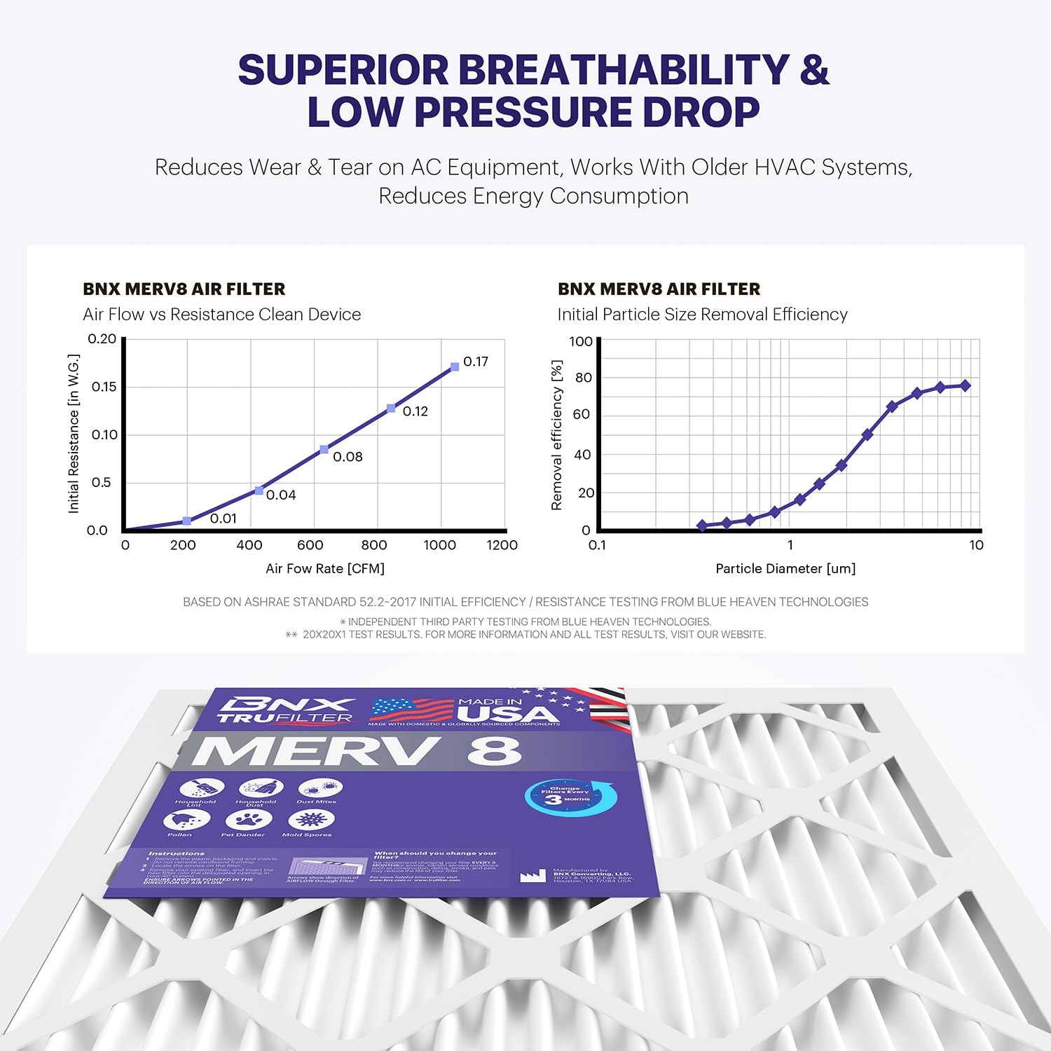 - SUPERIOR PERFORMANCE - The BNX MERV 8 100% air filter media outperforms standard fiberglass filters and adopts the latest in filtration technology to allow for industry leading superior low air flow resistance while maintaining the highest grade level of filtration.