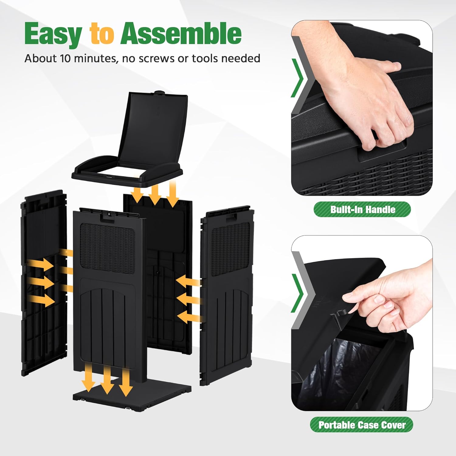 - Easy to Install Trash Bags: The waste bin for outdoors is compatible with 30-33 gallon trash bags. You need to lift the trash bag holder, put on the trash bag, put down the holder, and then finish the installation. After opening the inner lid, the garbage bag can be stably fixed in the card slot.
