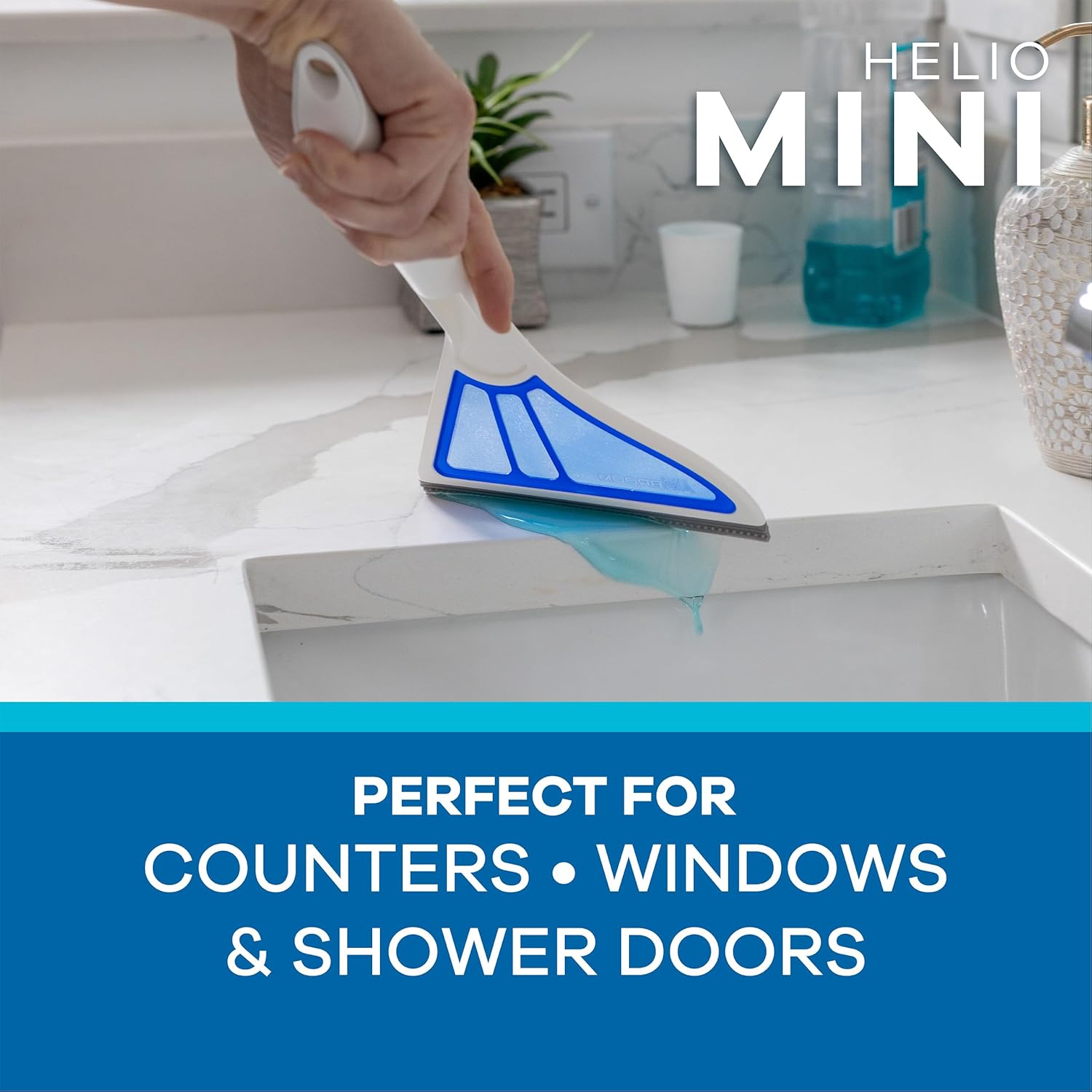 - Patent Pending Lift & Grip Ultra-Flex Blade: Uniquely designed ultra-flex edge efficiently picks up every dry and wet particle from any nook and cranny in the house. Includes a bonus Helio Air Broom mini for countertops and shower doors.