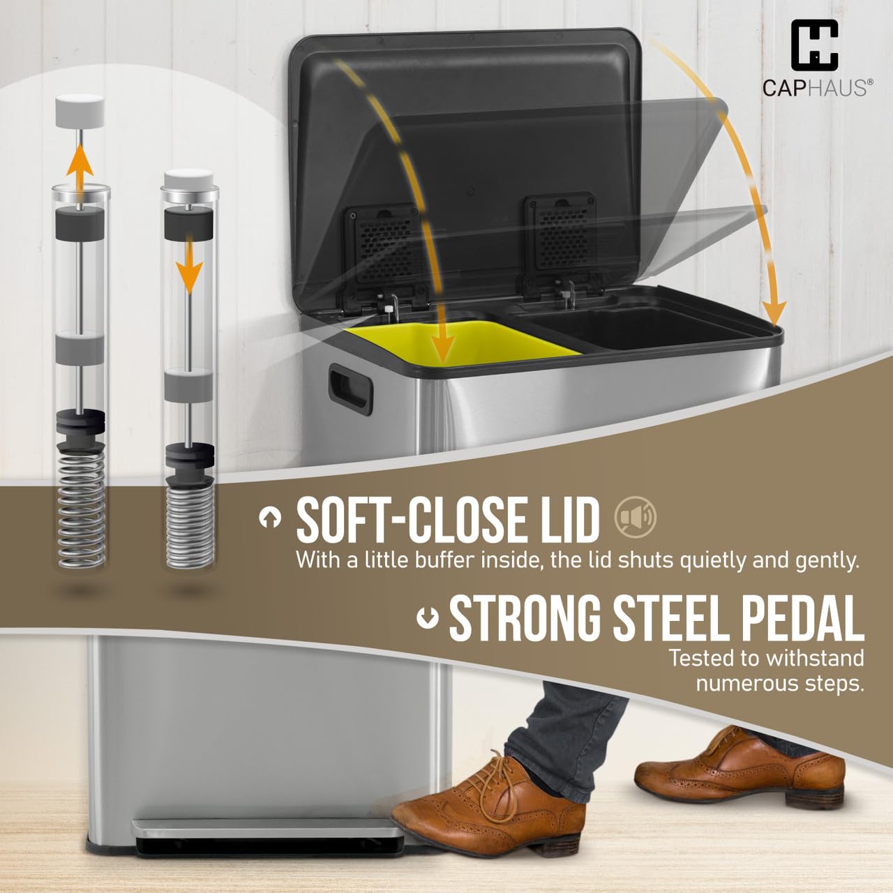 CAPHAUS Dual Trash Can with Lid, Trash and Recycling Bins Combo for Kitchen, Hands-Free Stainless-Steel Garbage Can with 2 Compartment, Hinged Lid, Odor Filter, Handles, 25L+25L, 2 x 6.6 Gallon