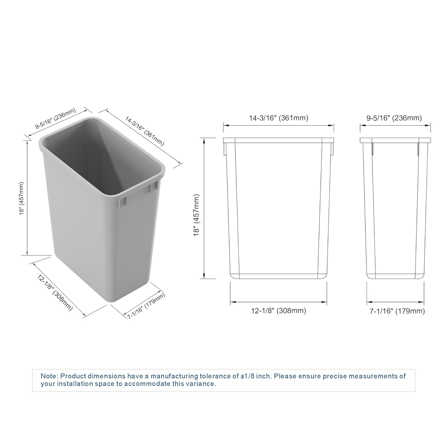 - Dowell 35L Wastebasket Trash Container Dimensions (W x D x H): 14.19"W x 9.31"D x 18"H; Bottom/Base Dimensions (W x D): 12.13"W x 7.06"D