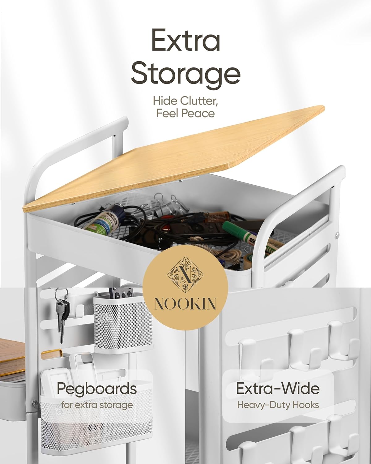 - 🎁【Bonus Accessories for Maximum Convenience】 Enjoy $20 worth of bonus accessories! This cart includes 6 heavy-duty hooks, perfect for hanging kitchen utensils, office supplies, or craft tools. Plus, 2 spacious mesh baskets allow for quick & easy access, ensuring everything stays within reach.