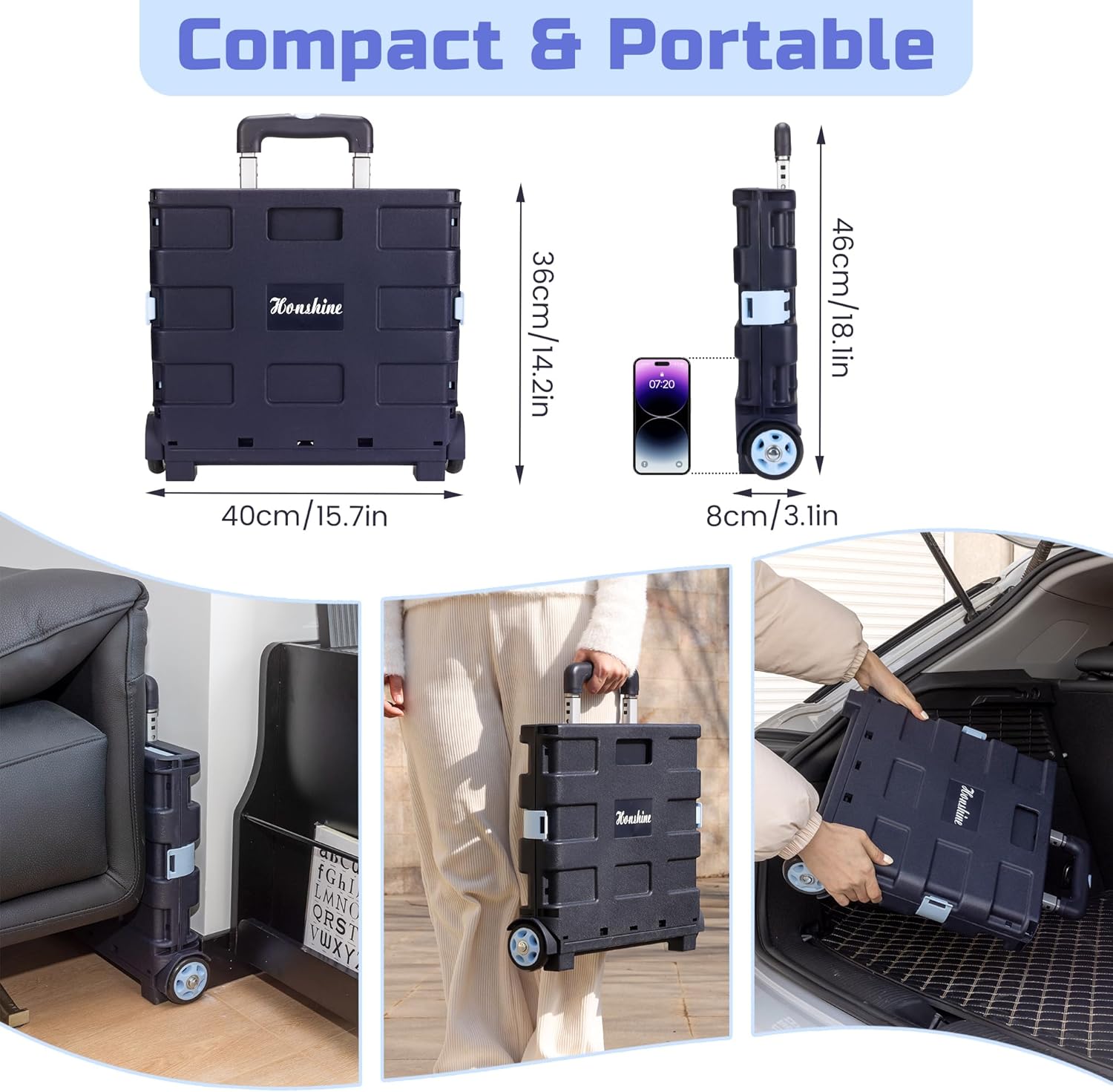 - Compact folded size: only a few inches thick after folded flat, allowing you to store it in the trunk, behind the door, under the desk or bring it around conveniently