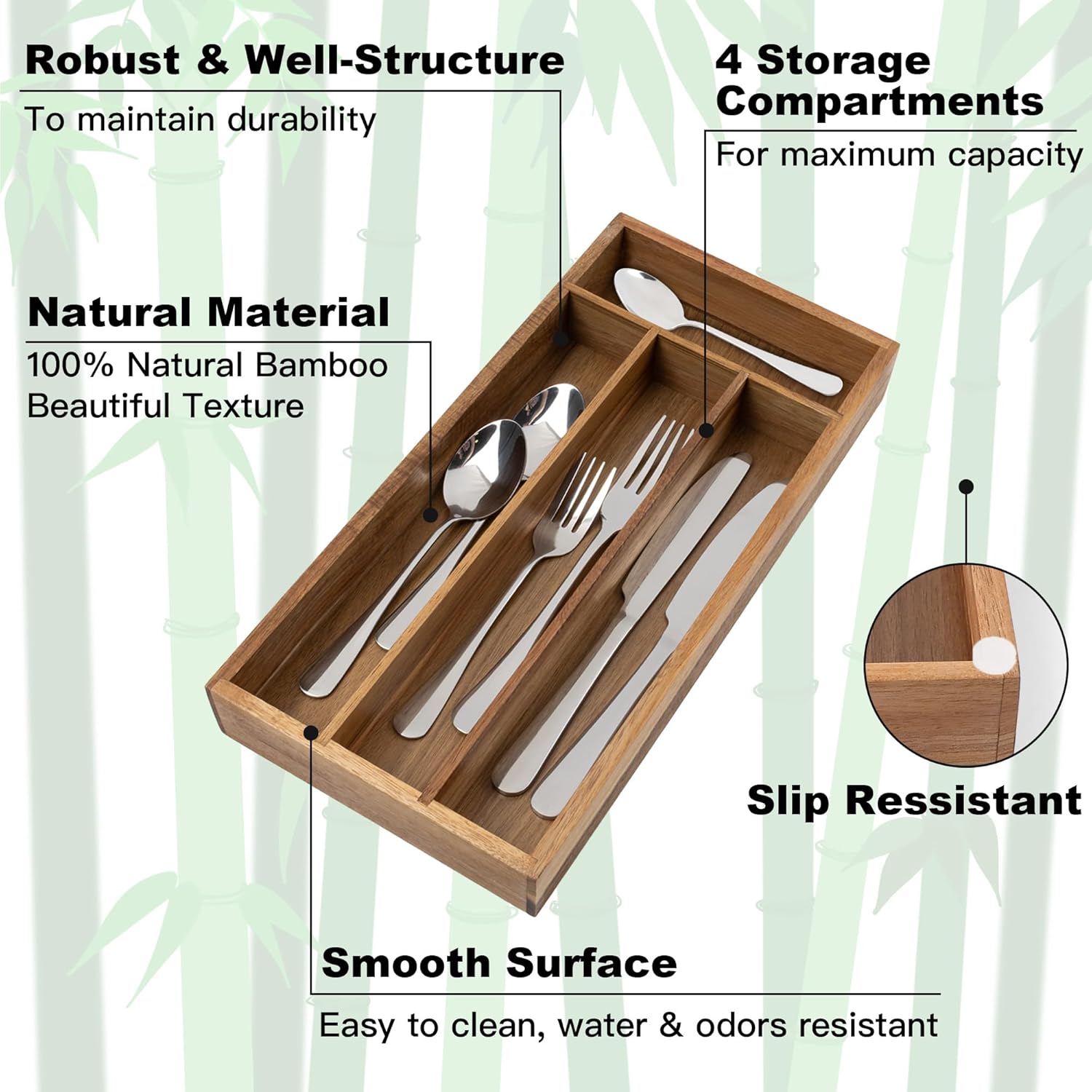 Acacia 4 Slot Silverware Drawer Organizer - Cutlery Holder with Flatware Tray