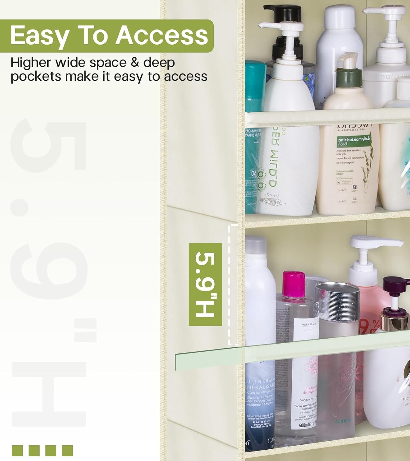 - 【Higher & Deeper Pockets】: The space between the pockets is 5.9", Large interlayer spacing design allows you can easily store tall bottles without falling out, such as toiletries, shampoos, make ups etc. Dimension of each Pocket:12.2"Wx6.5"Dx10.6"H;