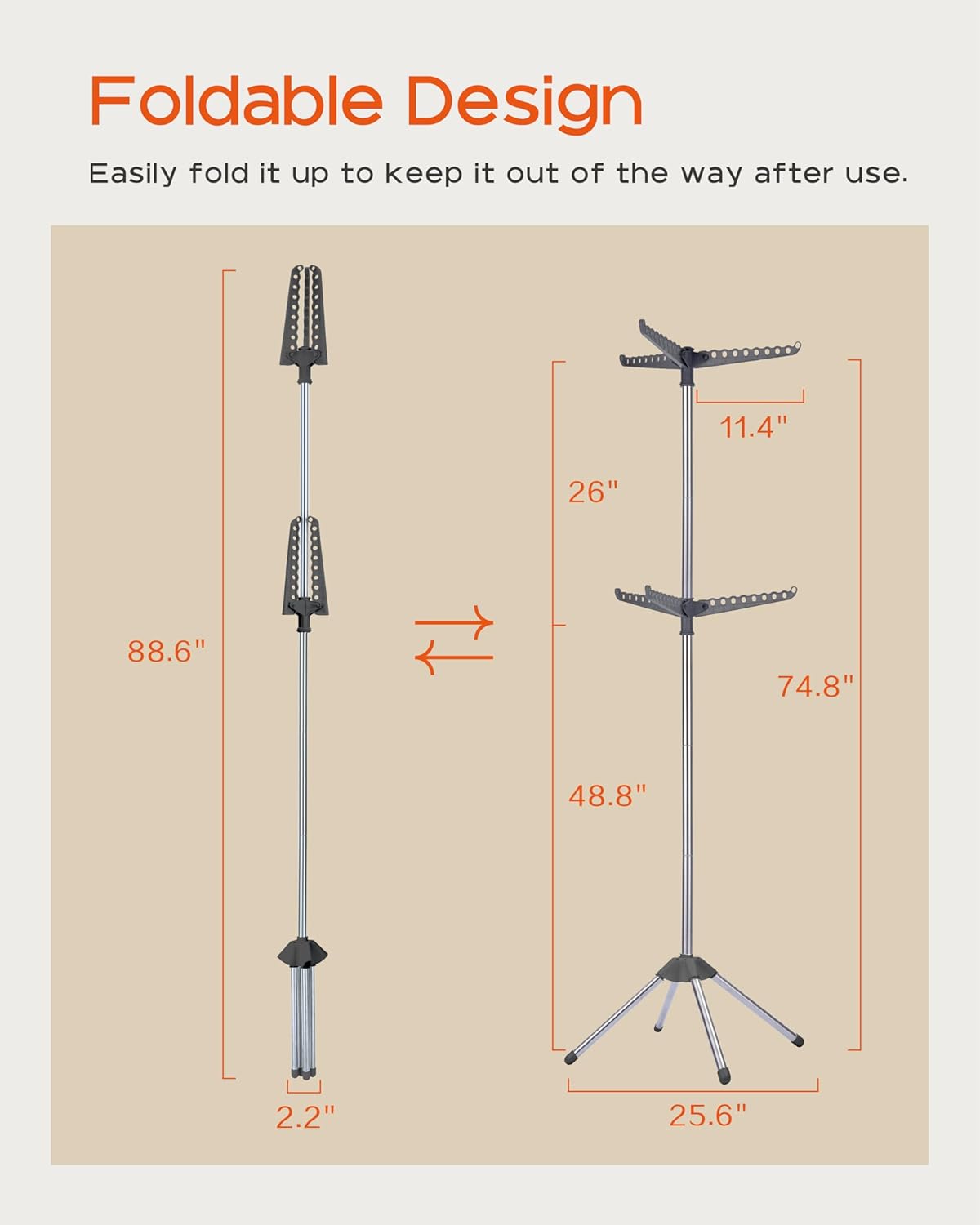 - [Foldable and Space-Saving] This vertical drying rack measures 25.6”D x 25.6”W x 74.8”H and takes up very little space. After use, simply fold the four legs and three drying rods into a smaller size: 2.2 "D x 2.2 "W x 88.6H, which can be leaned against the footrest, perfect for apartment laundry rooms or narrow spaces and corners.