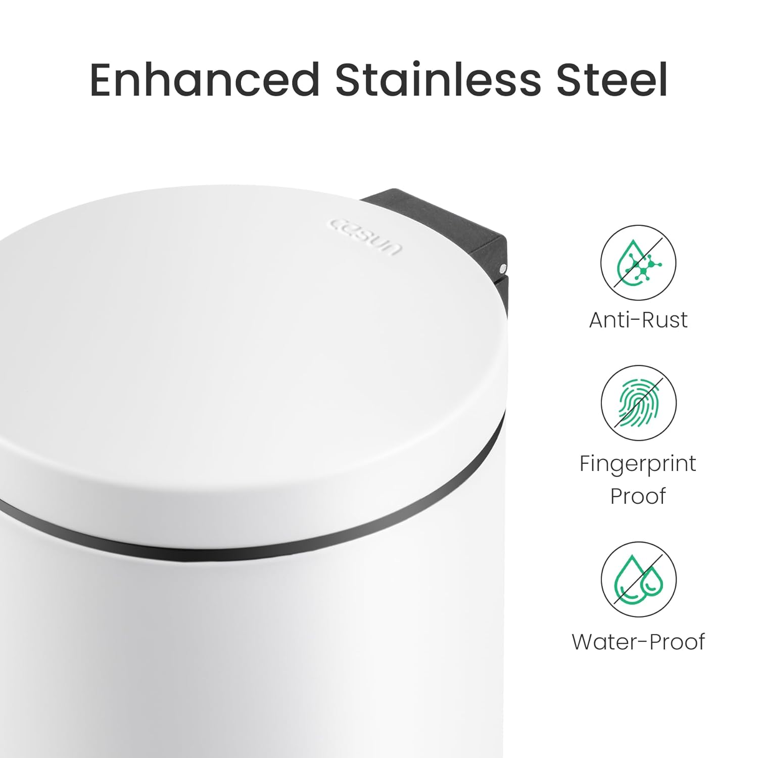 - Quality Construction: The white trashcan is crafted from sturdy stainless steel. And the strong steel pedal is built to withstand over 100,000 steps — that's more than 20 steps a day for 20 years