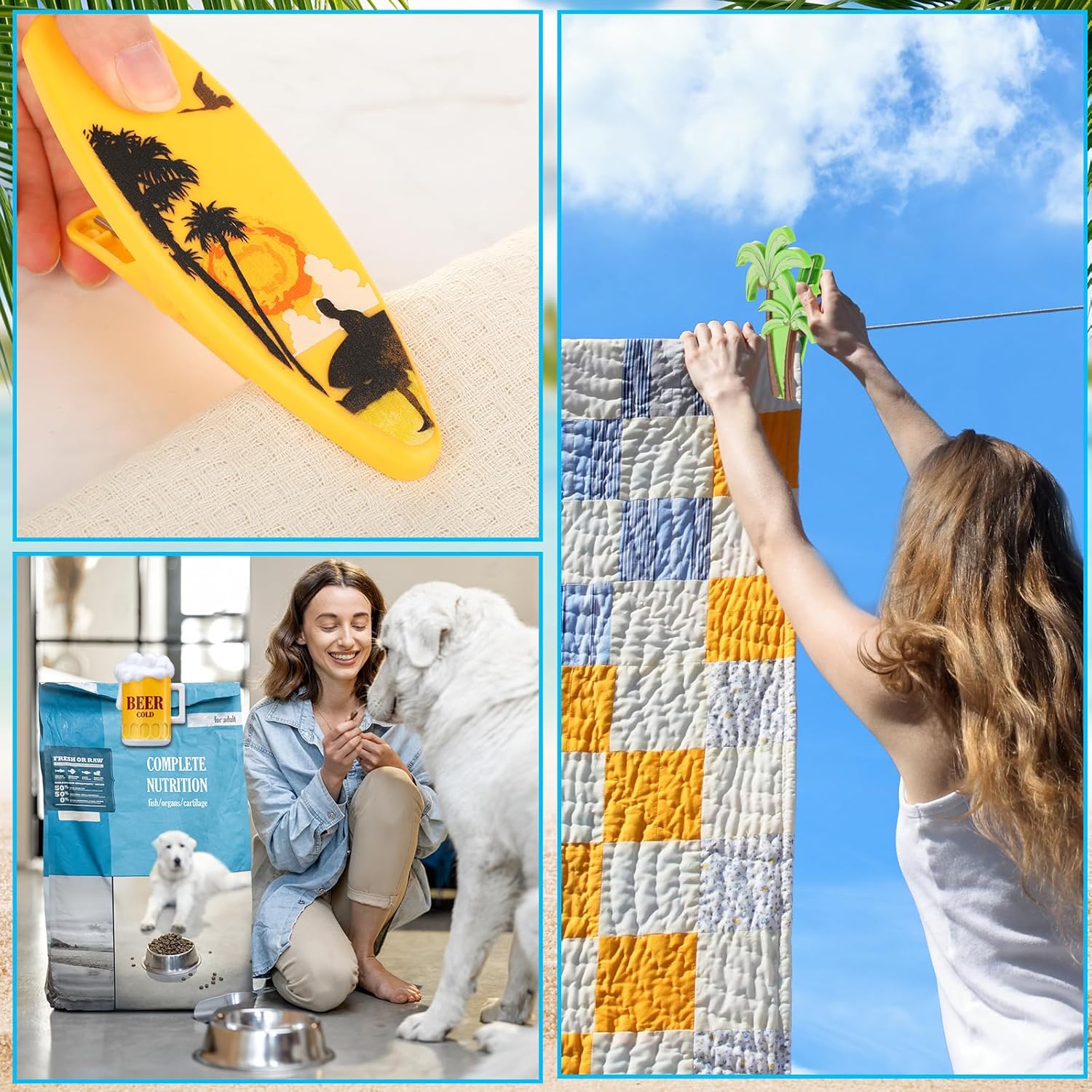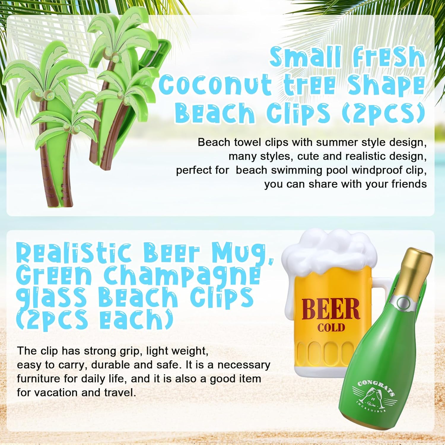 - Cute and Funny: these beach towel clips adopt palm tree, eyeglasses, cups, champagne bottle styles, look cute and funny, you can use them to clip cloths, towels or bedding