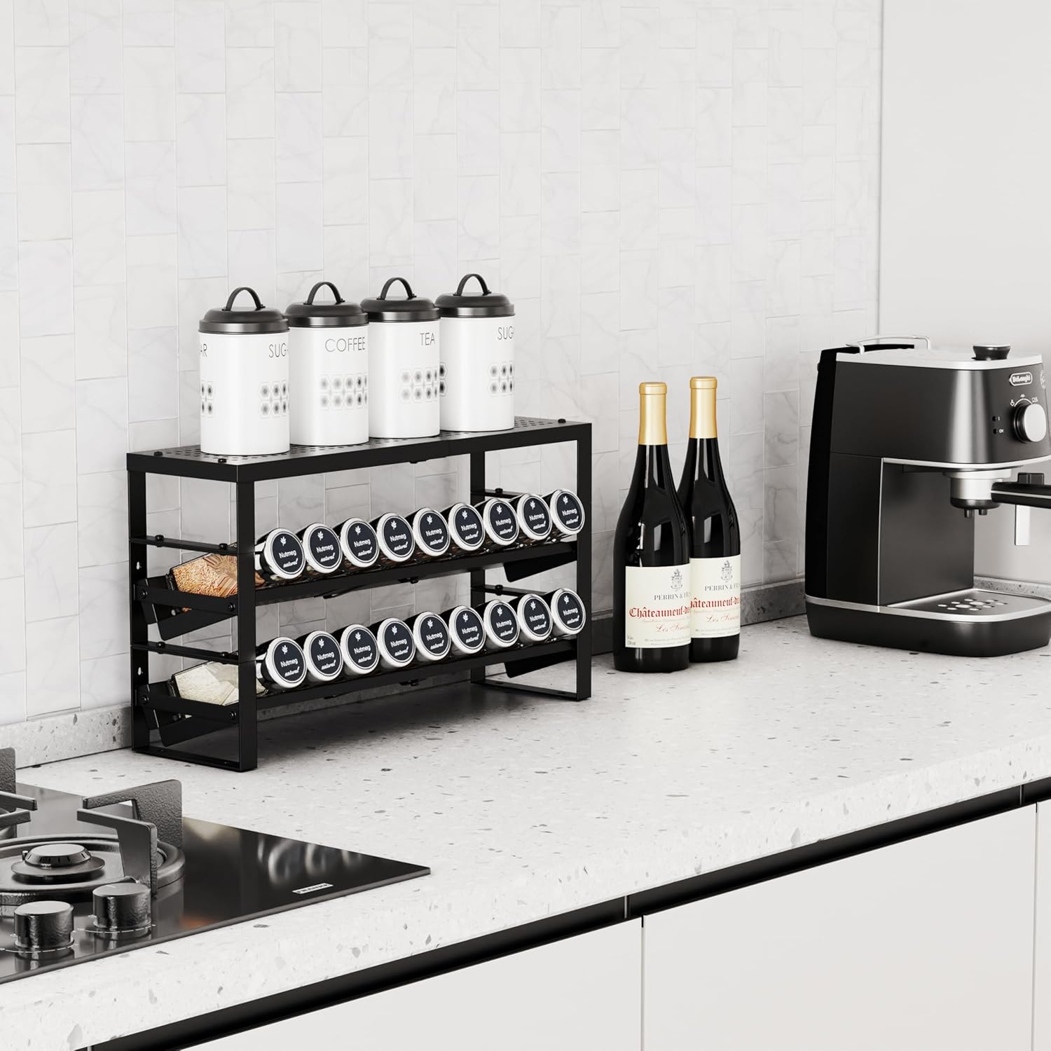 • ⭐【Sturdy Construction for Long-Lasting Use】Constructed from heavy-duty steel with a powder-coated finish, this spice rack is built to withstand the rigors of daily use. Whether loaded with your favorite spices or empty, it remains stable and secure.