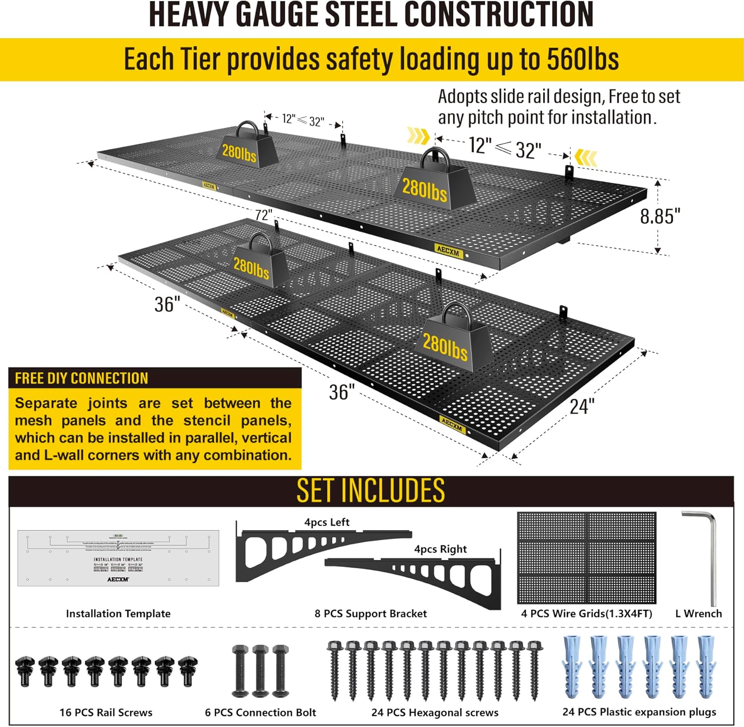 - Innovative Design: Unlike fixed wood stud spacing systems, Aecxm garage wall shelving feature an exclusive sliding rail screw design, allowing flexible installation on any wood stud spacing within the panel's length. Adjust freely and hassle-free
