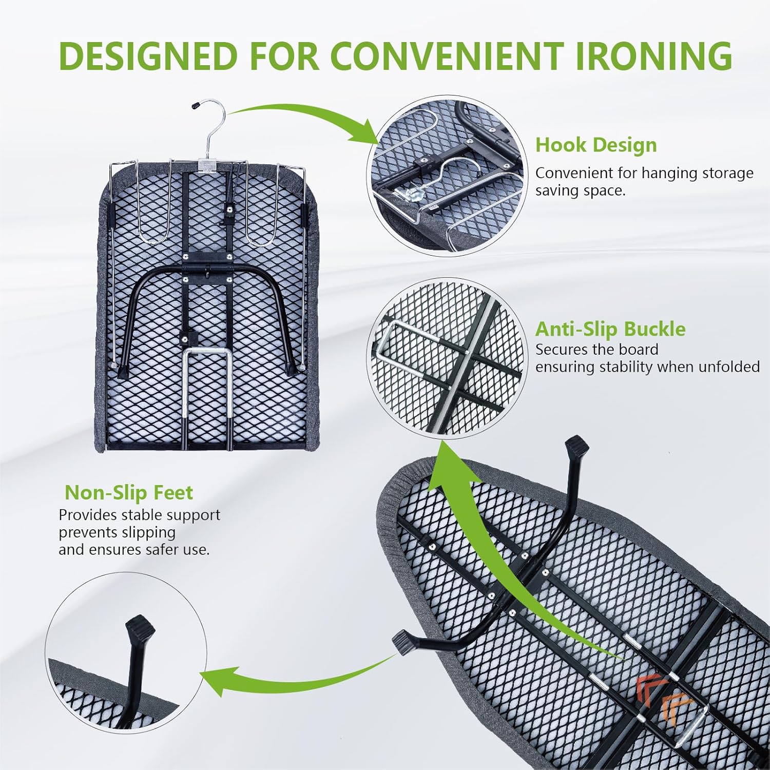 - Highly efficient ironing: the metal mesh panel helps to dissipate heat more quickly; Equipped with a heat-resistant cover and 100% cotton pads for good ventilation to prevent damage to the tabletop ironing board and clothes