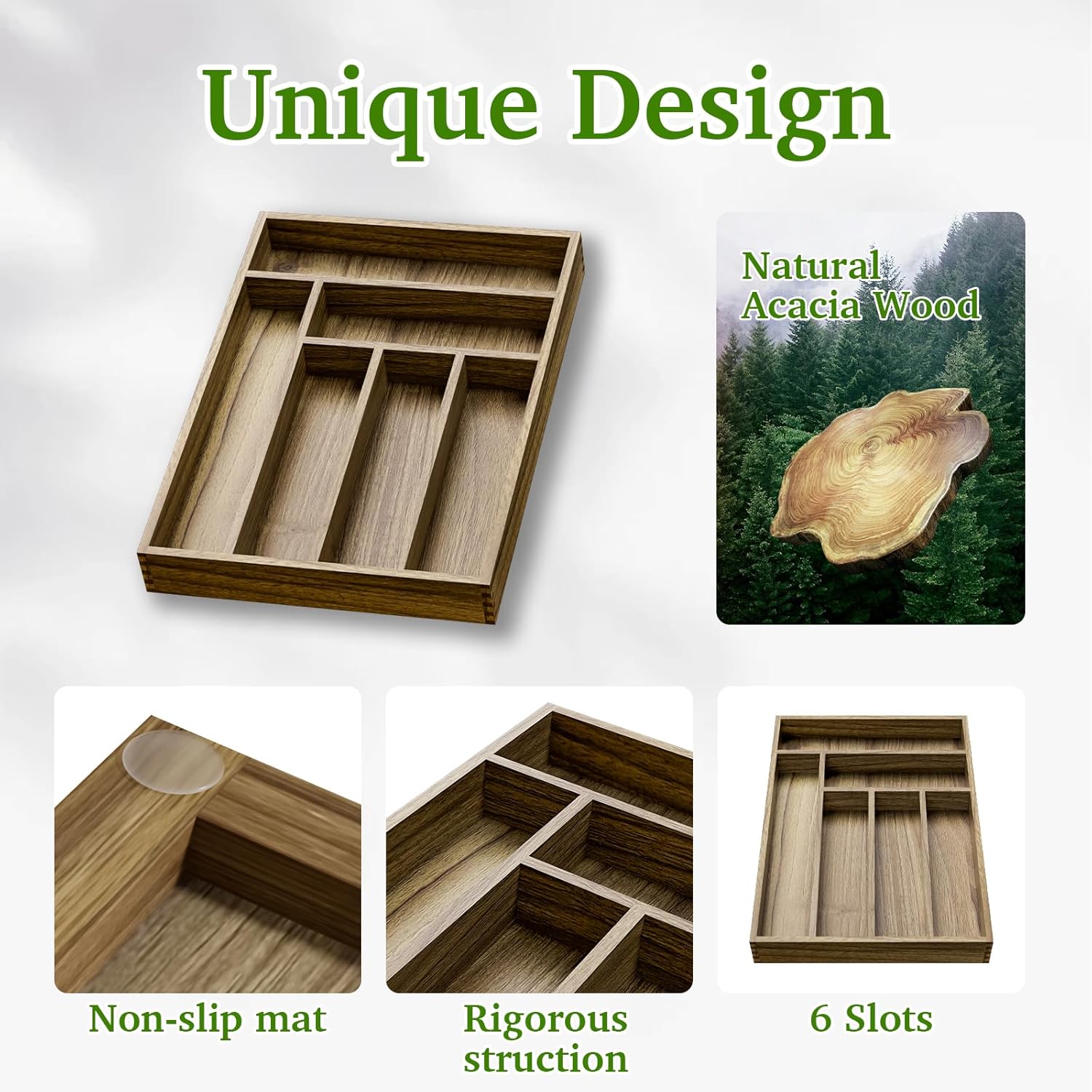 - šššš®š«šš„ ššššš¢š ššØšØš-Made of acacia wood, this silverware drawer organizer is very attractive, well made and easy to clean. More resistant than plastic and other materials. The color of natural wood is so beautiful and rich.