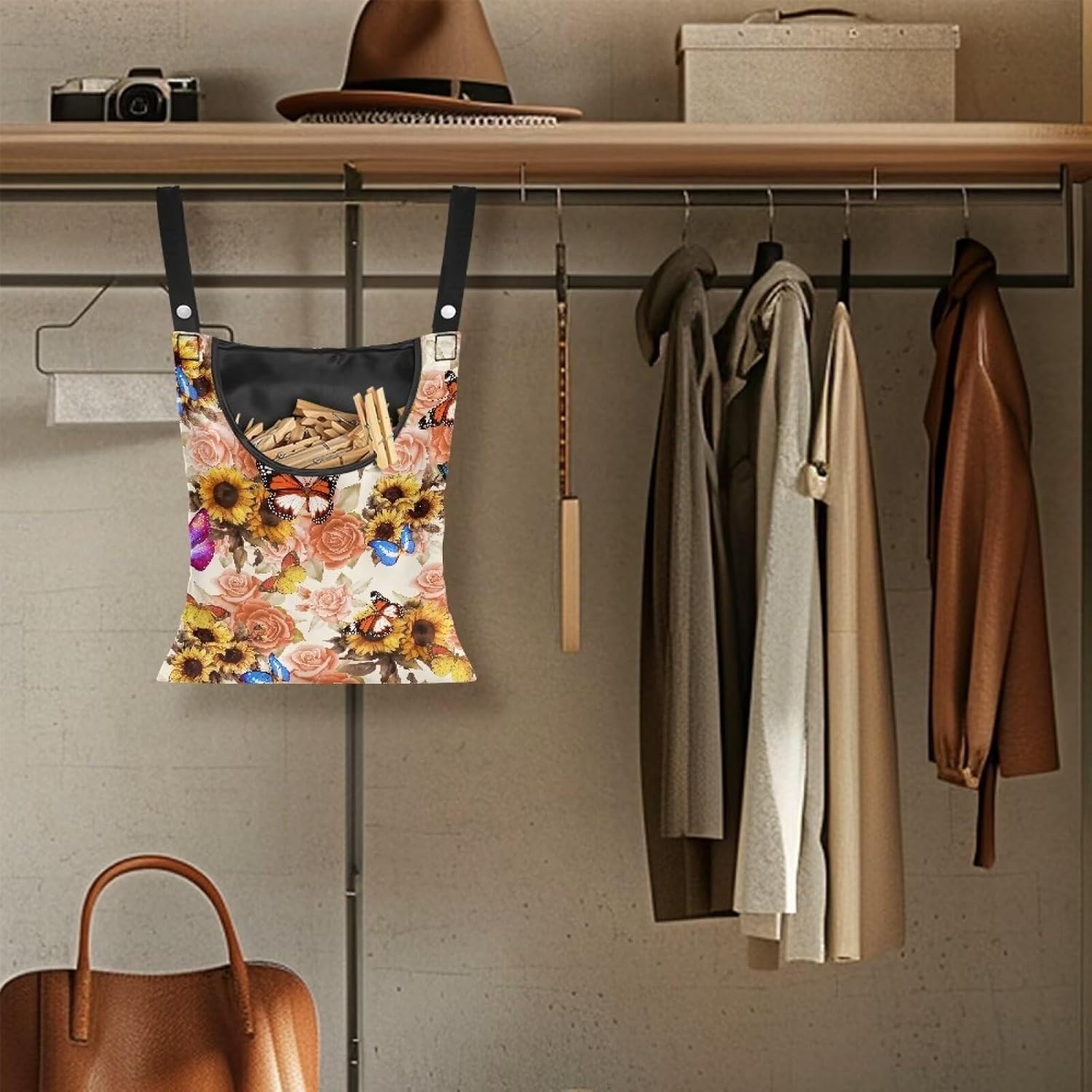 Butterfly Clothespin Bag with Hanging Sunflowers Rose Hook Waterproof Clothes Pin Hanging Bag Space-Saving Clothespin Storage Organize Clothespin Bag for Clothesline Outdoor