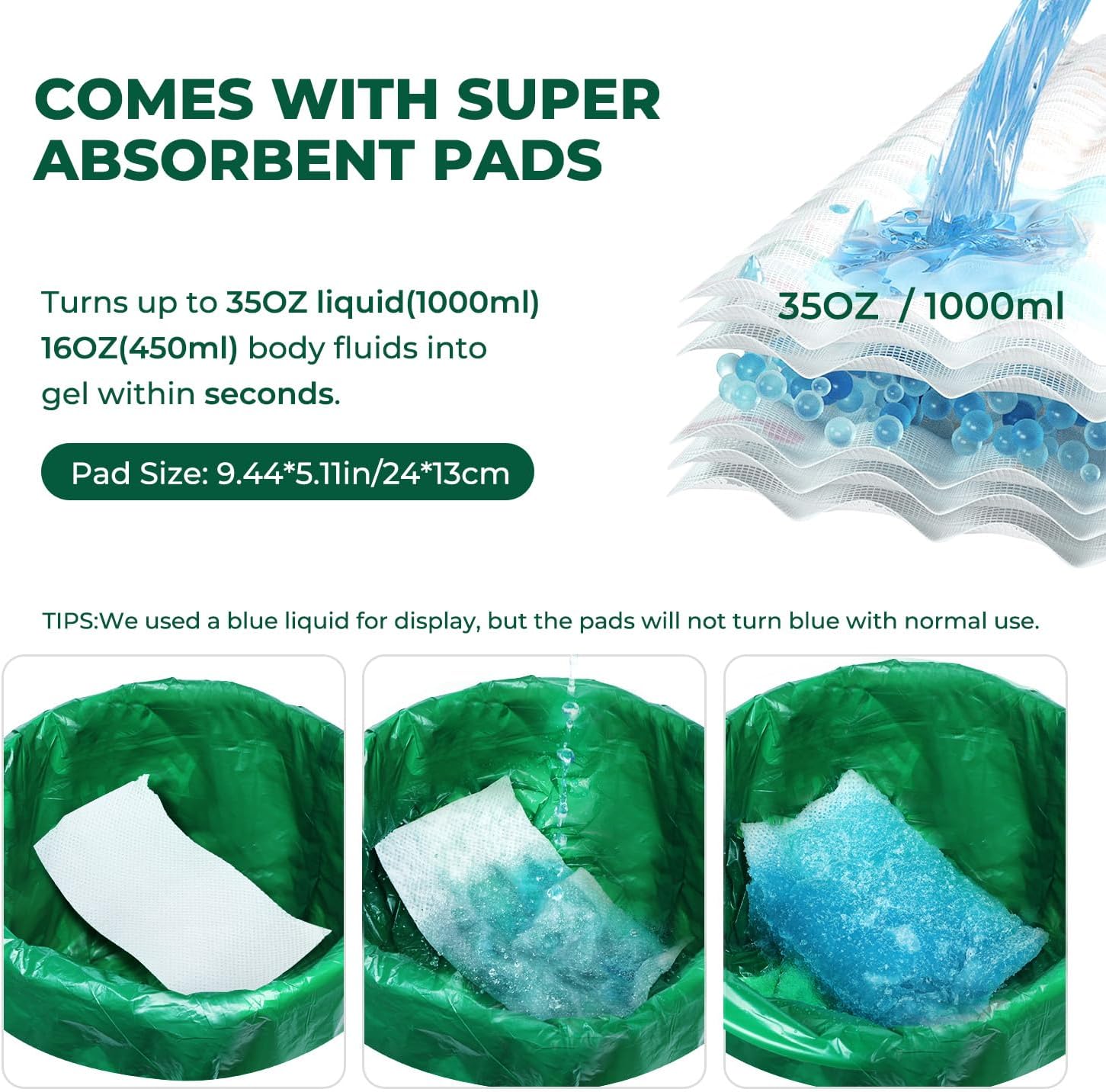 - SUPER ABSORBENT COMMODE PADS: Each potty chair liner built-in an absorbent pad. The commode absorbent pads measured 9.44x5.11in, liquid to solidify without spill. Solidify 35OZ(1000ML) of WATER/16OZ(455ML) of BODY FLUID into a gel in seconds, absorbing urine well and reducing odors