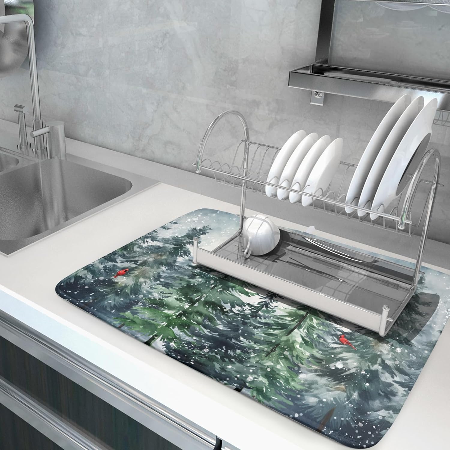Christmas Tree Dish Drying Mat for Kitchen Counter Winter Pine Tree Dish Drying Mat 18x24 Inch Red Bird Christmas Dish Draining Mat Absorbent Reversible Dish Pad Kitchen Accessories Table Protector