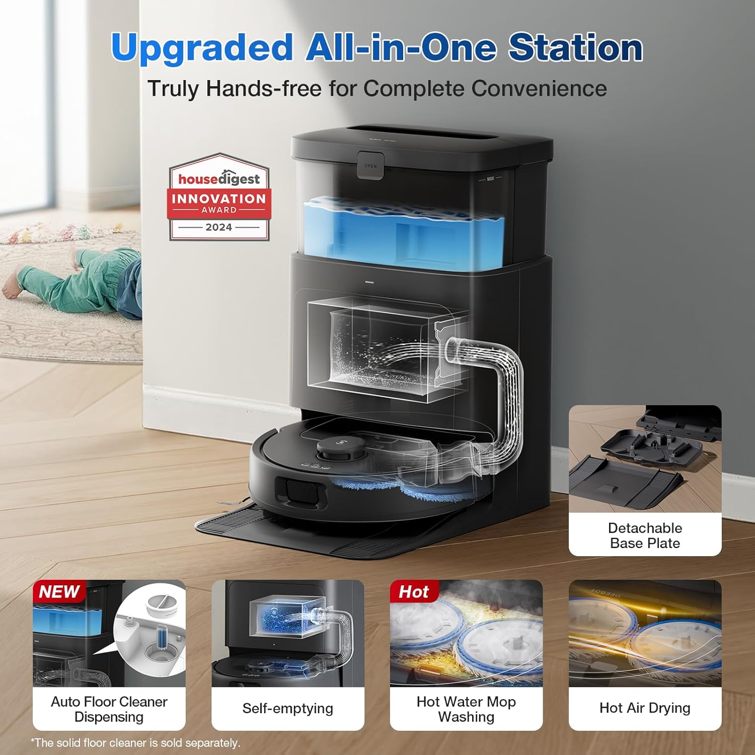 - Unbeatable 10,000Pa Suction Power - Powered by advanced motor and airflow technology, DEEBOT N30 PRO OMNI boasts a powerful 10,000Pa suction that deep-cleans surfaces, effortlessly removing dirt and debris from hardwood floors, tiles, and carpets. Coupled with ZeroTangle 2.0 anti-tangle technology, it ensures thorough and efficient cleaning while minimizing hair wrap-ups from humans and pets on the main brush.