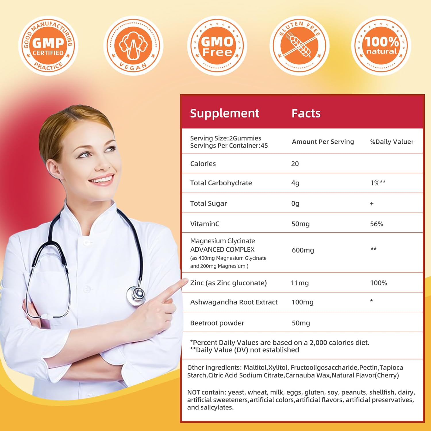 - Unlock wellness with every chew! : Experience the ultimate relaxation and sleep support with our premium Magnesium Glycinate Gummies. Dive into a world of relaxation with every chew. These gummies are crafted with Magnesium Glycinate and Ashwagandha, it works together to helps ease muscle tension, enhance cognitive function. Provide you with comprehensive relaxation and wellness benefits. Say goodbye to restless nights and wake up refreshed and rejuvenated