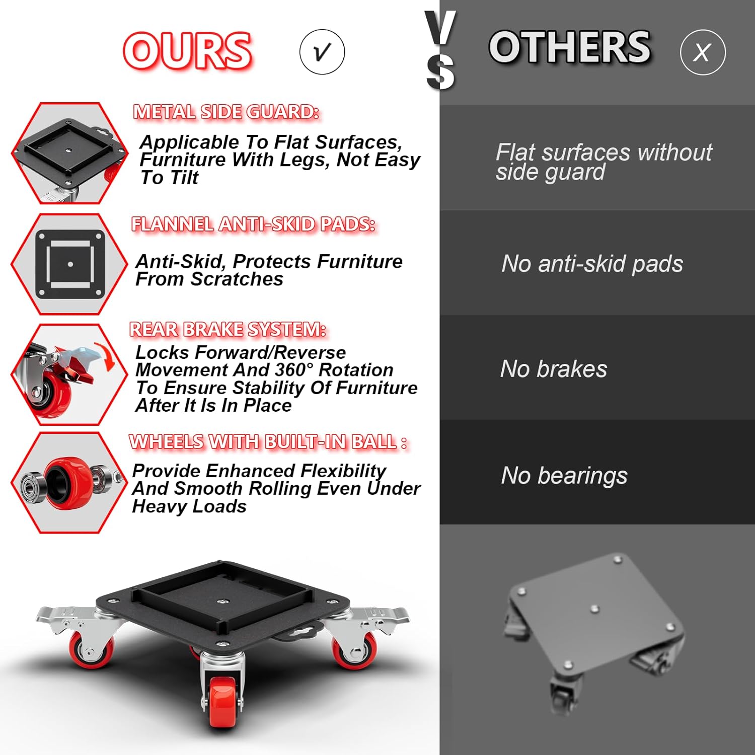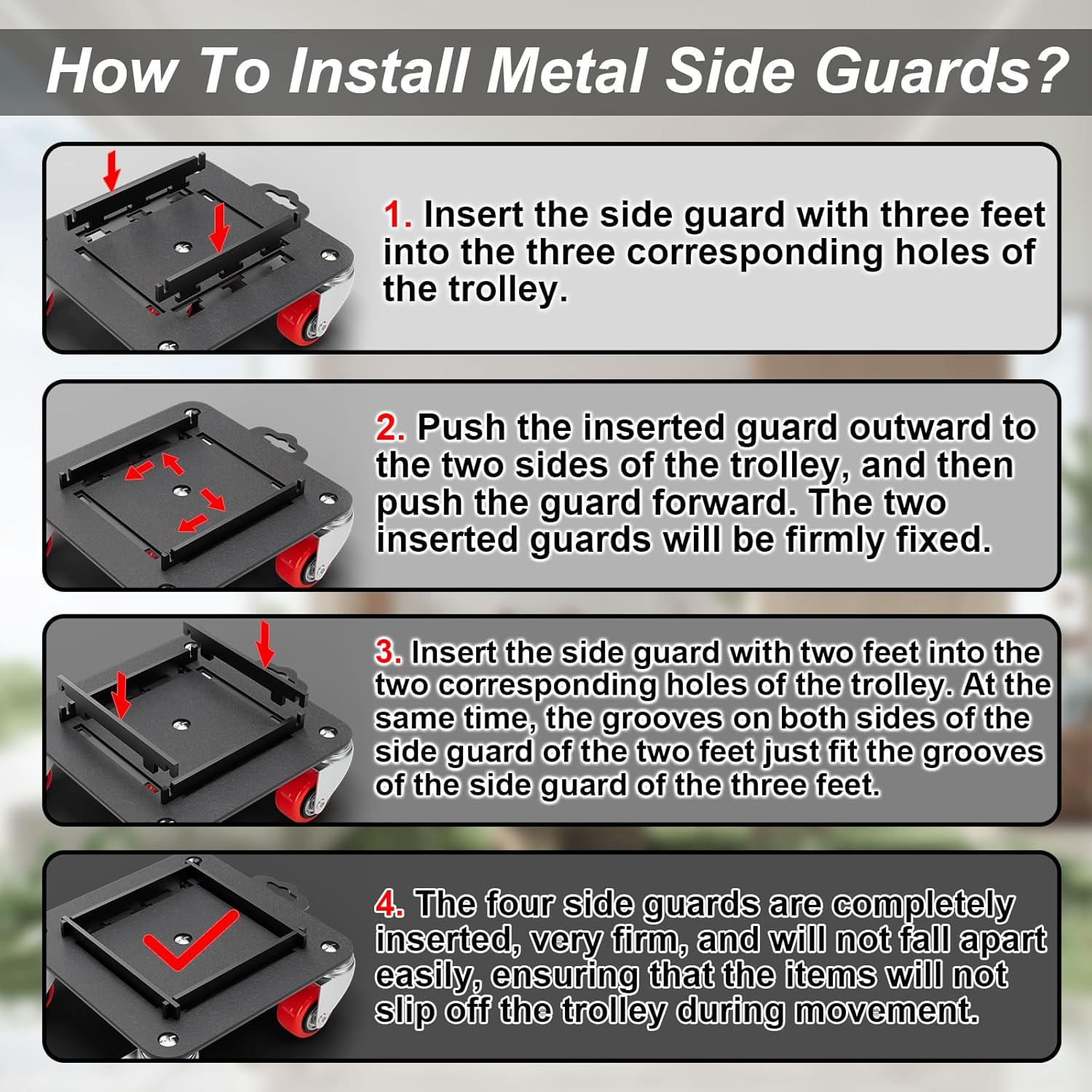 - [Removable Side Guard Design for Secure Moves]:This upgraded heavy duty furniture movers features metal side guards that are firmly secured to stabilize items with legs,preventing tipping during transport.Ideal for safely moving tables,chairs,and other furniture with legs,this innovative feature sets these furniture dollies apart for safe,controlled moving.