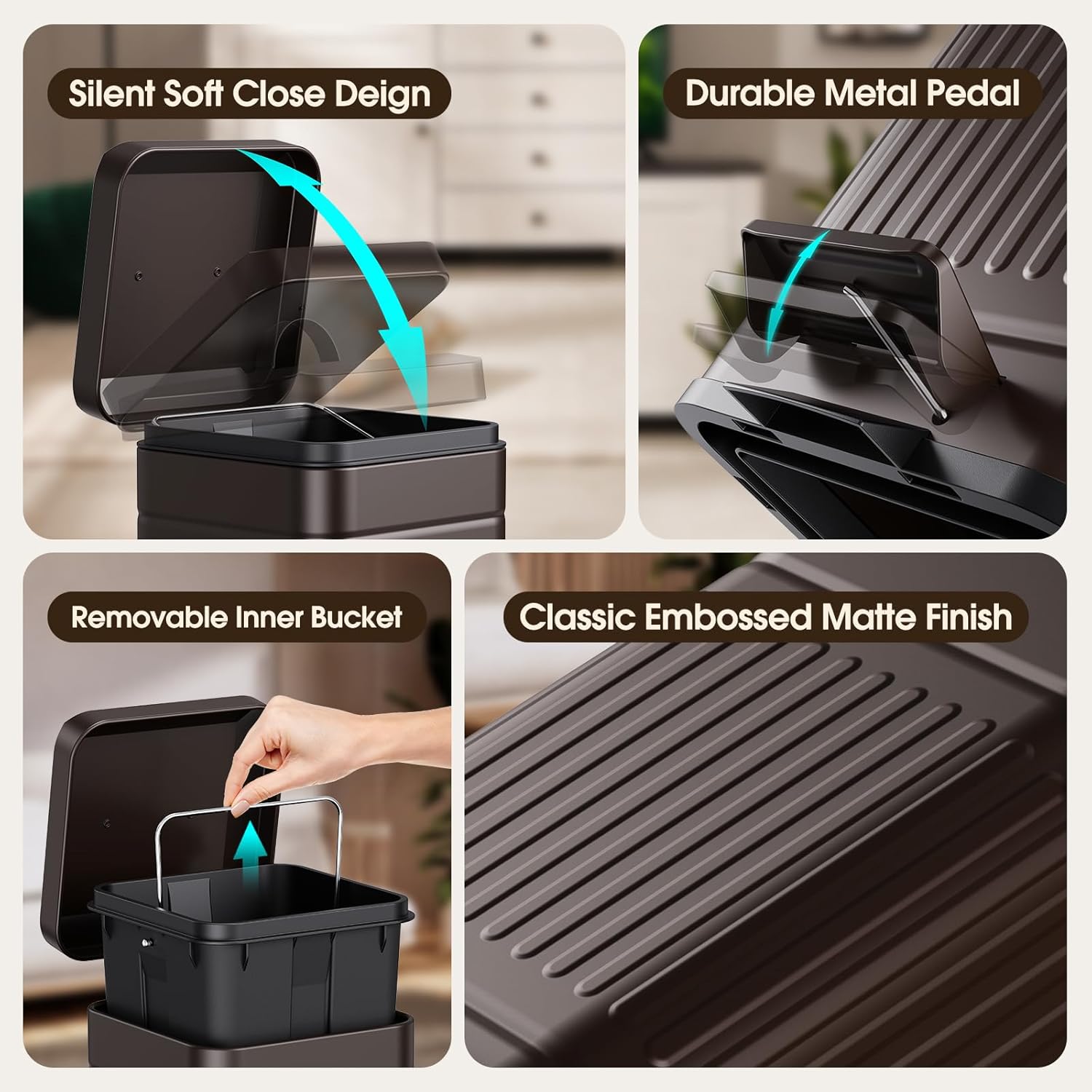 - Silent Soft Close: The step trash can has a damper arrangement that retards the close of allows the lid to close quietly and safely by itself every time, donβt worry about disturbing the rest of your family