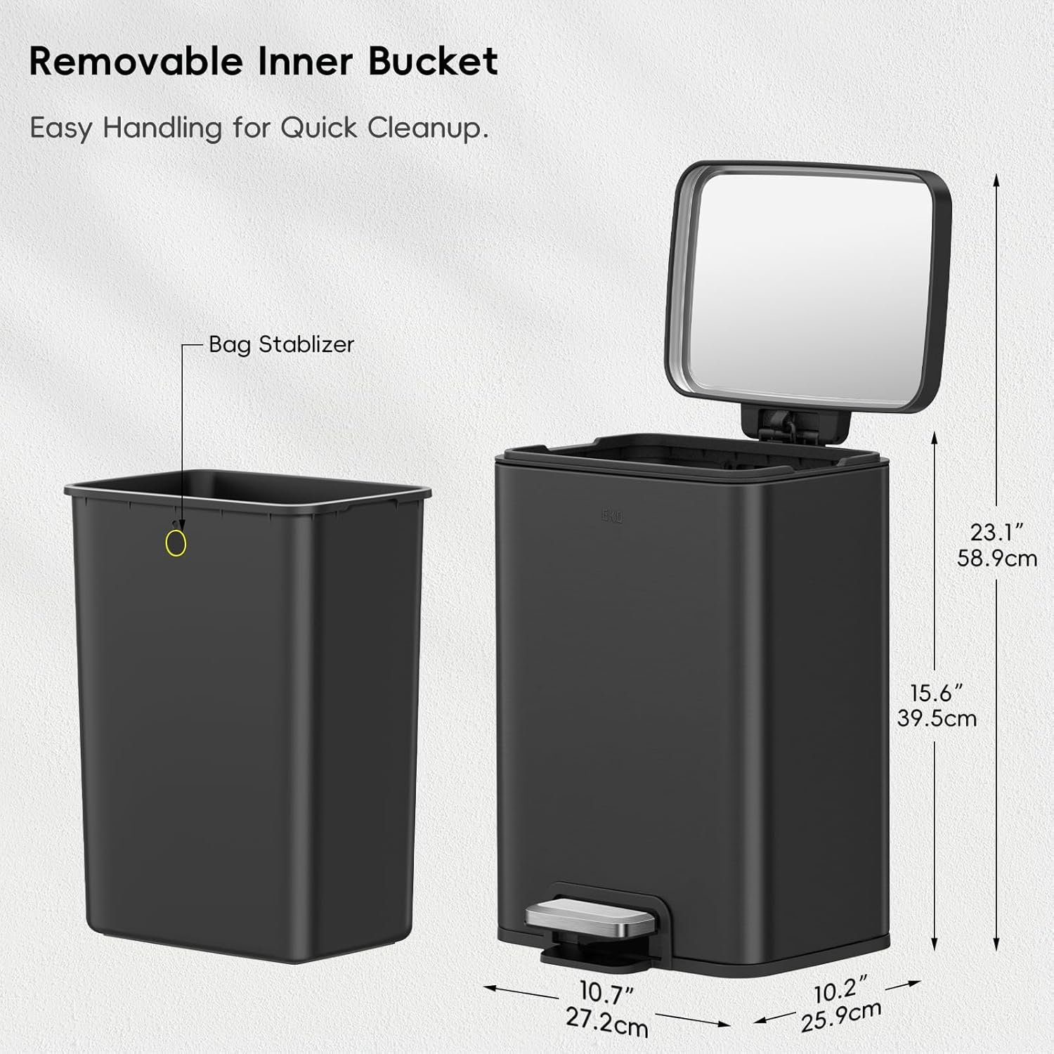- SOFT CLOSE & STAY-OPEN LID: Enjoy the convenience of a lid that opens and closes smoothly and silently with a simple push of the pedal. The lid can also stay open at a 90° angle as long as you need, making disposal tasks easier.