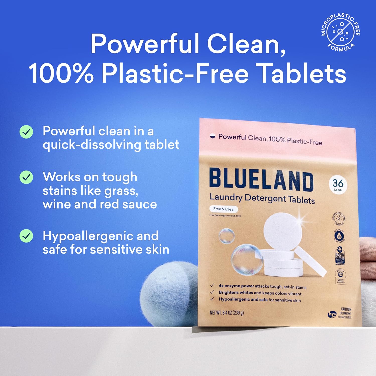 BLUELAND Laundry Detergent Tablets, 60 Count, Plastic-Free Eco-Friendly Pods, Sheets, Liquid Alternative - Fragrance Free and Clear, Natural, Gentle