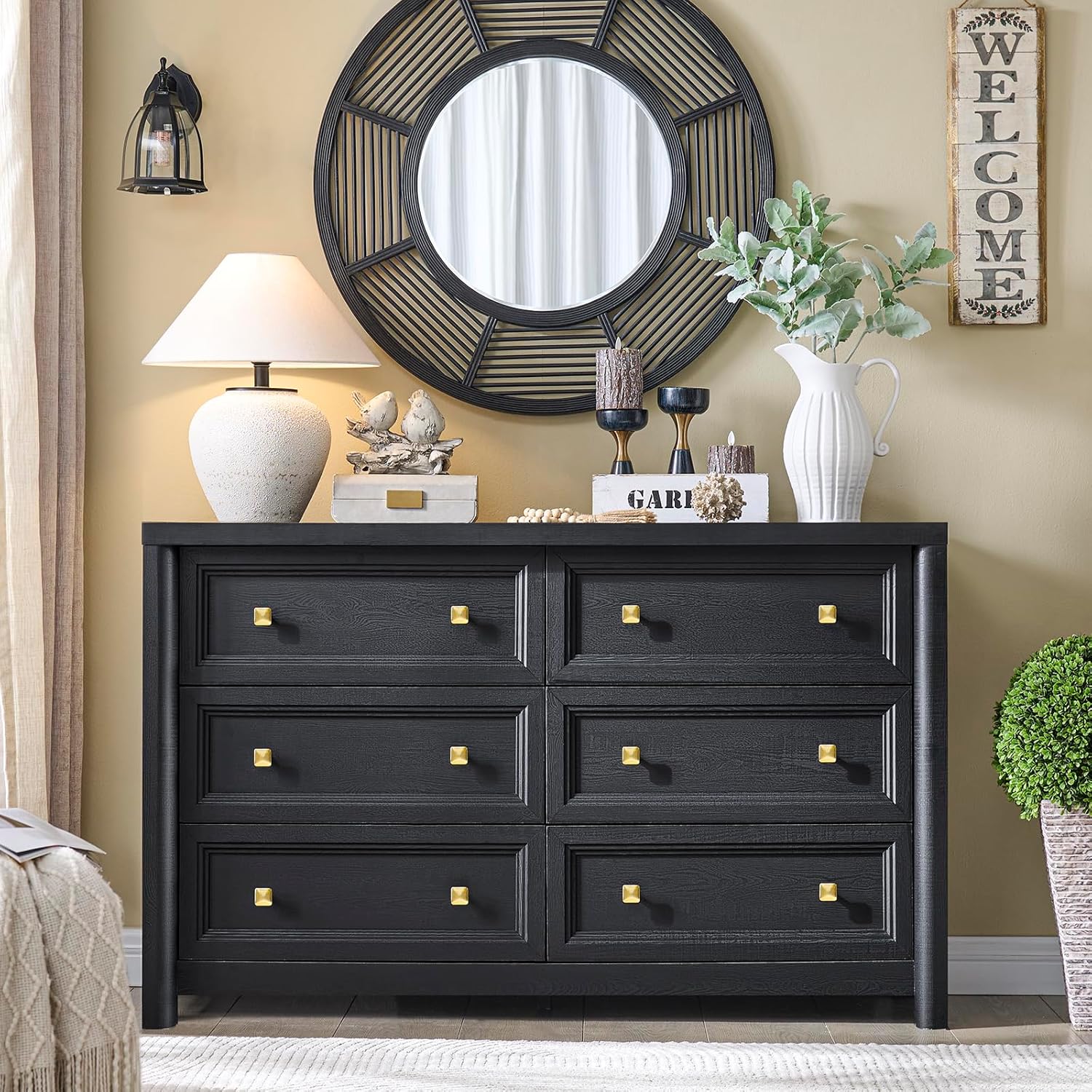 - Wooden Farmhouse Dresser: Embrace the beauty of vintage aesthetics with this 6-Drawers dresser.Designed with embossed textures and curved edges on the furniture, the chest of drawers exude sophistication and elegance. The farmhouse and modern design is elegant and stylish for all types of your home